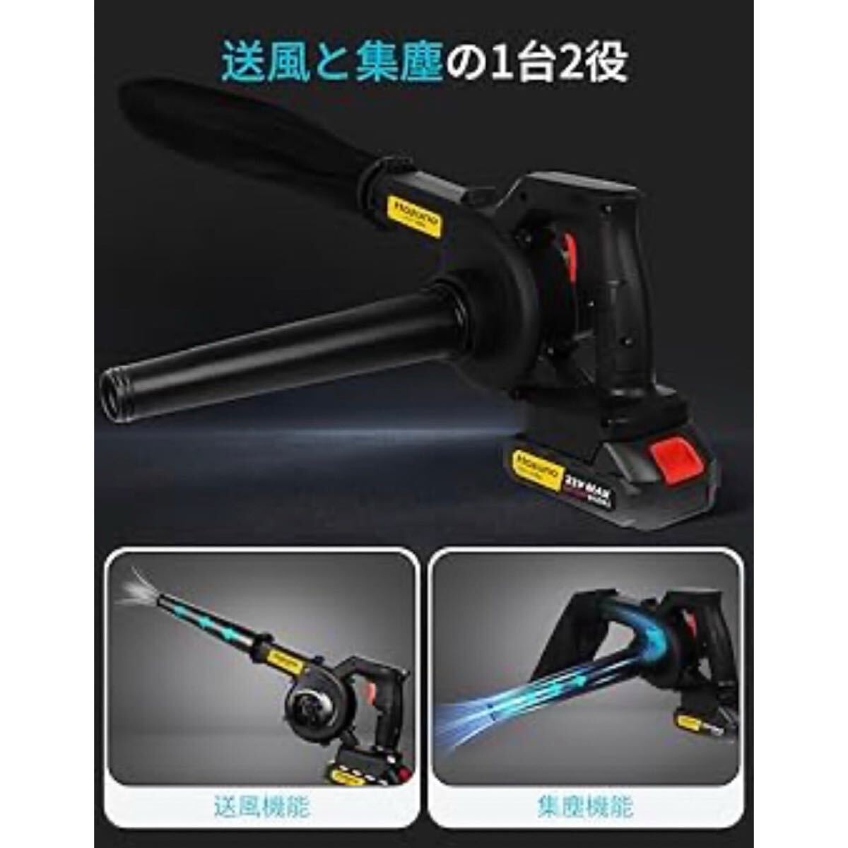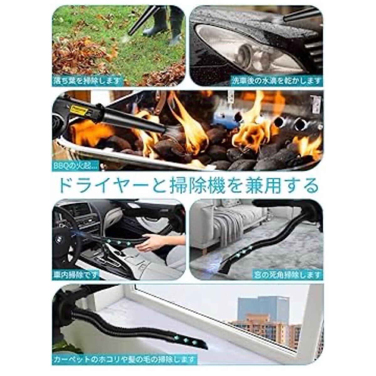 【広範囲に使える】ブロワーは吹き飛ばし・吸い込み機能付きの2ways使えます。庭の落ち葉掃除、車内の掃除、家具のほこり、コンピューターや他の電気製品の内部に積もったほこり、BBQの火起こし、洗車後の水飛ばし、作業場所の掃除など。壁の隅やベットの下、髪の毛のゴミを簡単に吸い込みます。注意事項:吸塵の際は、鋭利な物、濡れた物、石・砂利、金属片といったものを吸い込まないでください。