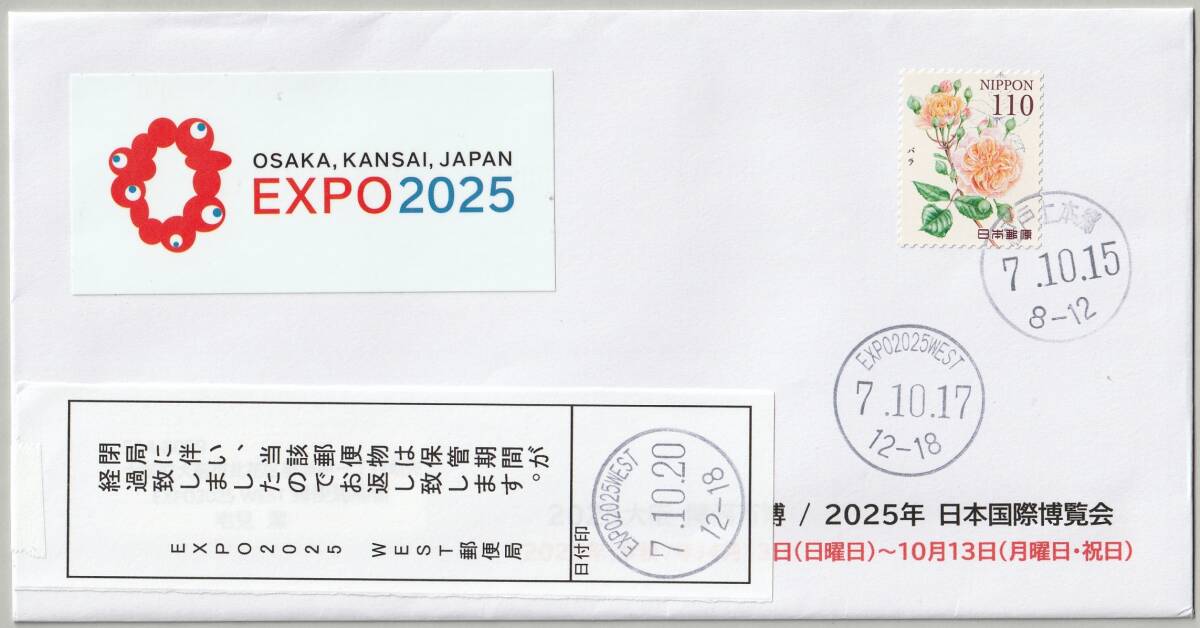 大阪・関西万博を記録する実逓便★EXPO2025 WEST局宛 閉局保管期間終了付箋/EXPO2025 WEST局より返却●令和7年10月20日付