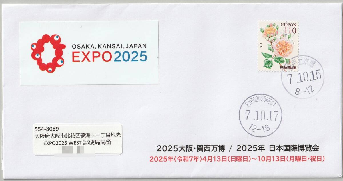 千葉県内から令和7年10月15日午前中に「EXPO2025 WEST局」へ向けて普通郵便を差出