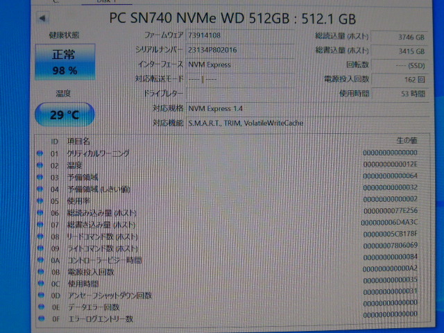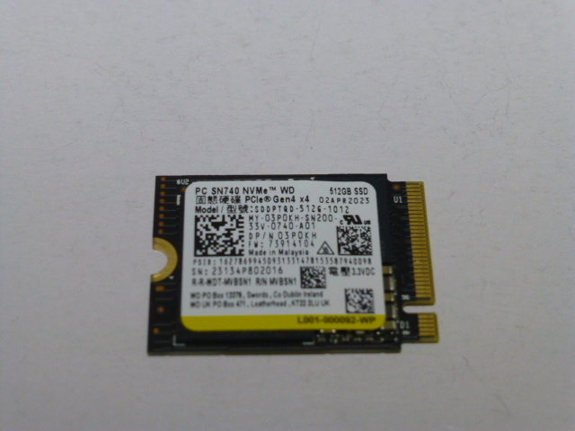 WD SN740 SSD M.2 2230 NVMe Gen4.0x4 512GB 電源投入回数162回 使用時間53時間 正常98% 中古品です SDDPTQD-512G-1012