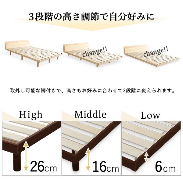 | 【ポイント】 お好みに合わせて3段階に高さを調節できる宮セット脚付きベッドです。 北欧産パインフレームを使用した、通気性と耐久性に優れた頑丈設計です。 やさしい無垢材のナチュラル、爽やかなホワイトアッシュ、シックなブラウンの3色がございます。 低ホルムアルデヒド仕様で、F★★★★(フォースター)獲得!お子様にも安心です。 |