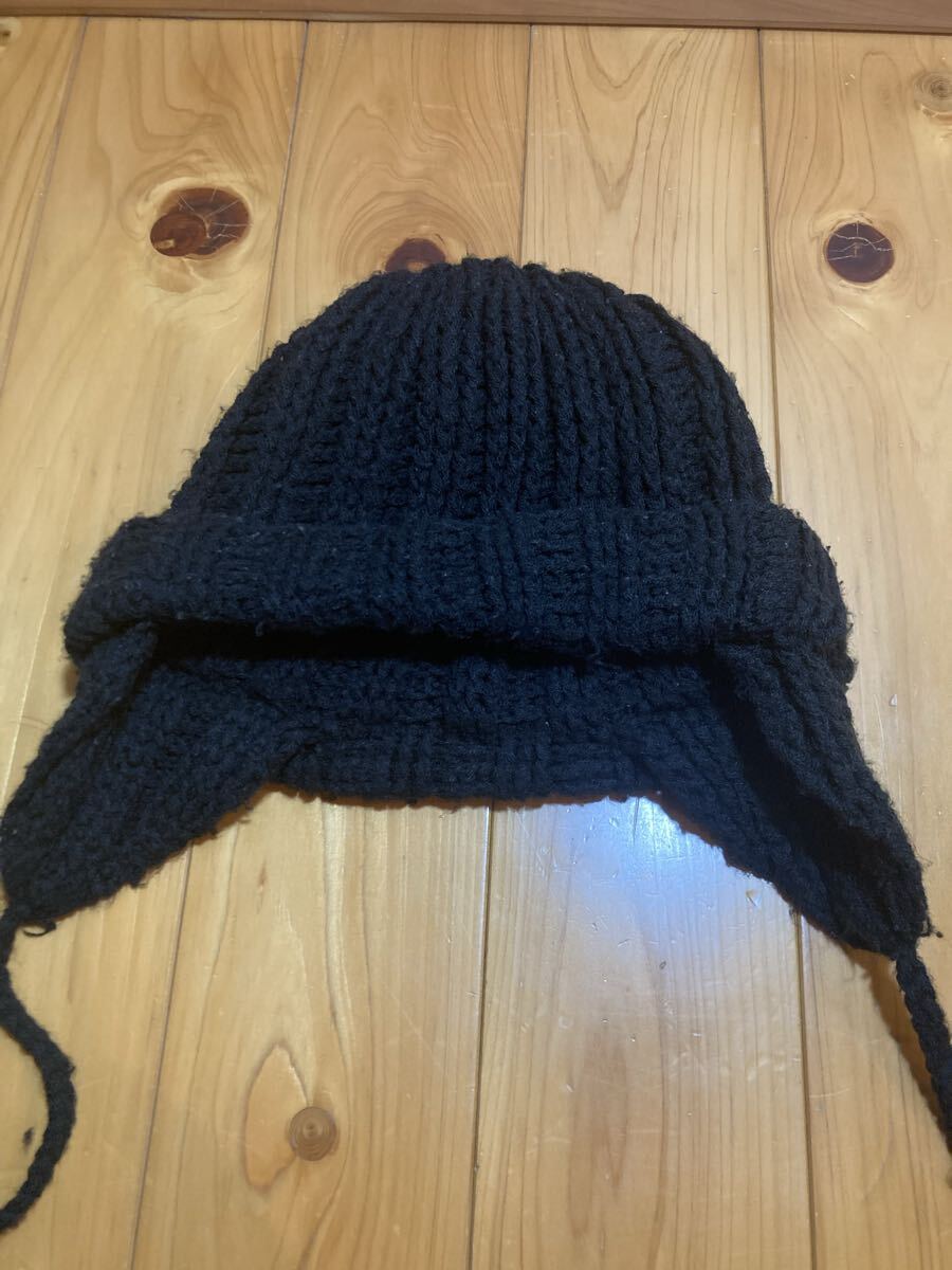 耳あて付きの黒いニット帽で、寒い季節に最適です。少々ですが毛玉があります。