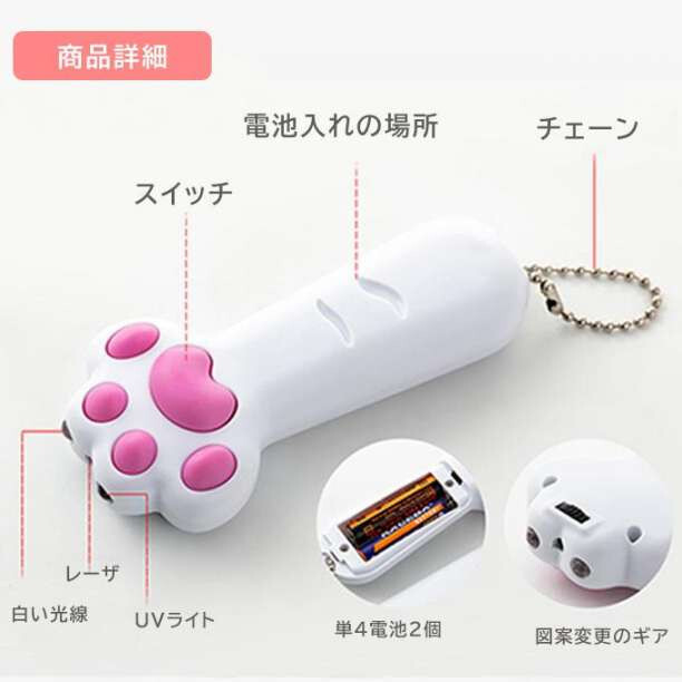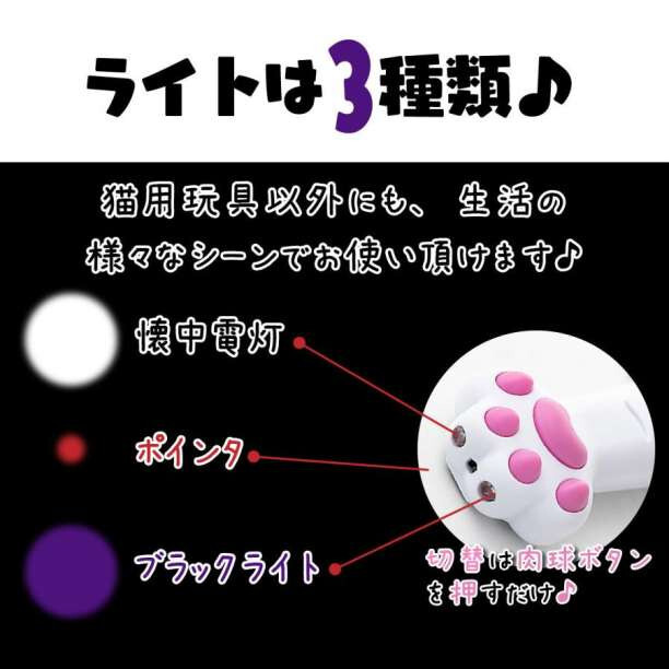 肉球部分を押せばレーザー以外に懐中電灯やブラックライトにも切替が出来ます。
