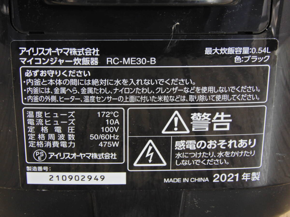 A2821★\1~アイリスオーヤマ 家庭用 マイコンジャー炊飯器 容量:3合炊き model:RC-ME30-B