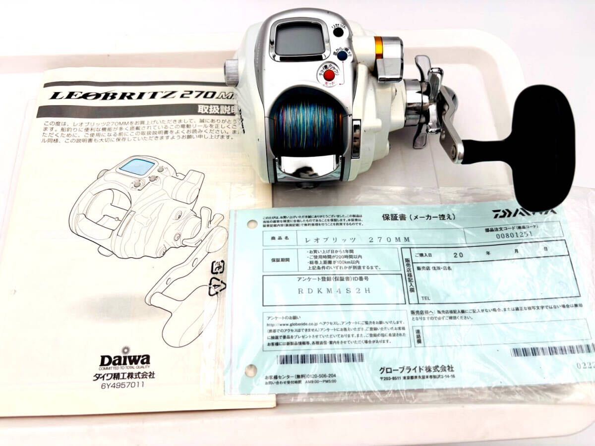 ダイワ レオブリッツ 270 MM です。 付属品は電源コードです。 機能や機関に問題ありません。 ※デジタル数字変化、クラッチ動作、レベルワインド動作確認しております。 取扱説明書なしの商品につきましては、釣具屋でメーカー取り寄せを希望すれば数百円で取り寄せ可能です。またメーカーホームページにて閲覧印刷も可能です。廃盤機種に関してはその限りではありませんのでご了承下さい。 他にも電動リールを出品しておりますので宜しくお願い致します。