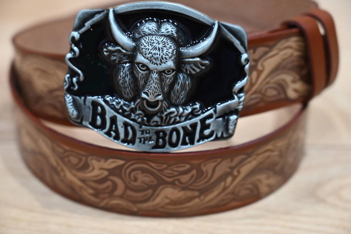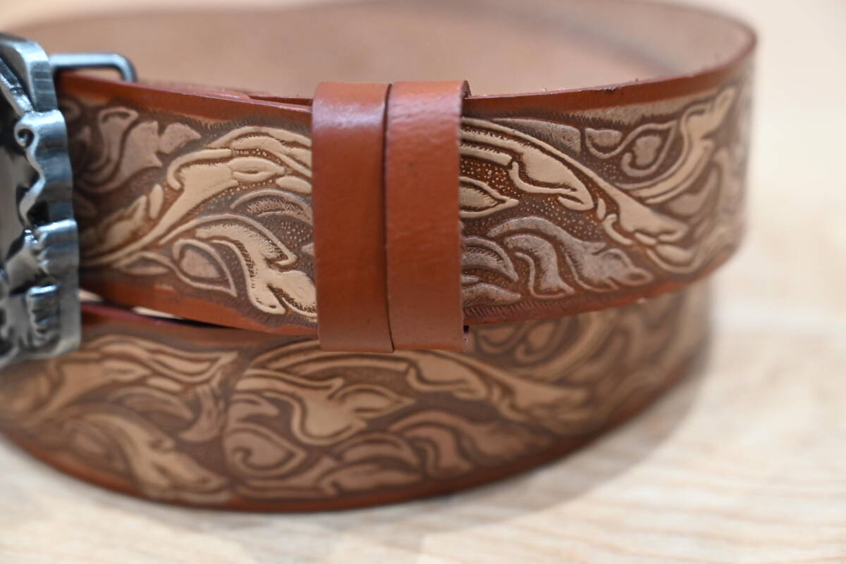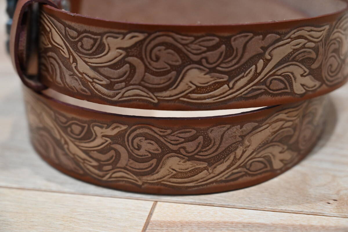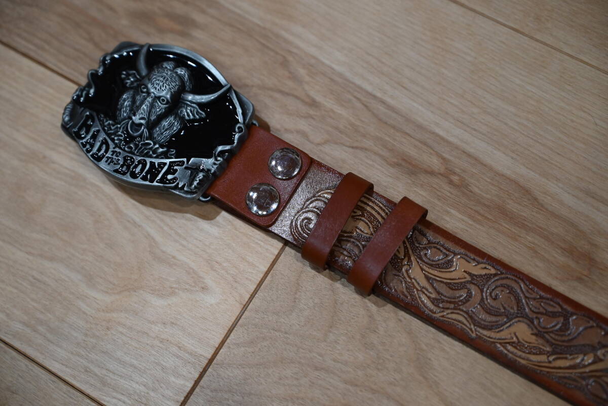 | 商品説明 | 牛革で作成した、カービング柄 バックル付き炎舞柄ベルトです。 色は茶で、未使用品になります。 サイズは、ベルト本体は108㎝、幅は3.7㎝、バックルは約縦7㎝×横8㎝程になります。 全体に葉茎を炎舞柄の様にデザインしています。色も濃淡を付けて仕上げています。ベルトの厚さは約3㎜程になります。 バックルの部分は、ボタンタイプなので、交換も可能になっています。バッファローで「BAD TO THE BONE」のロゴが入っていますので、インパクトが出ています。 ベルトの穴あけは、購入者の方にお願いします。フリーサイズで可能になるよう当方では加工無しの状態で出品致します。 発送は、定形外郵便を利用します。送料は、450円になります。 こちらは、ハンドメイドなので、多少の傷や汚れ等はご了承下さい。細かい点まで、気になる方はご遠慮下さい。 |