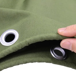 シートの4辺はコードを通して補強しており、端を持った際にも掴みやすくなっています。合計10個のハトメ付きなので、ロープを通してタープや幌としてお使いください。