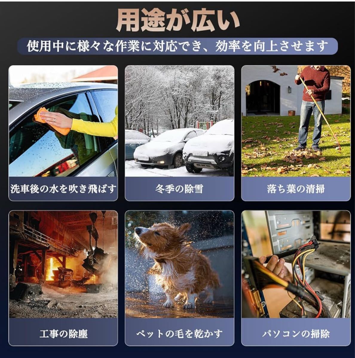 ■ 洗車後の水飛ばし、冬季の除雪、落ち葉掃除、PC内部清掃、BBQの火起こし、ペットの毛乾燥、工事現場など多目的に活躍する強力ターボブロワー。