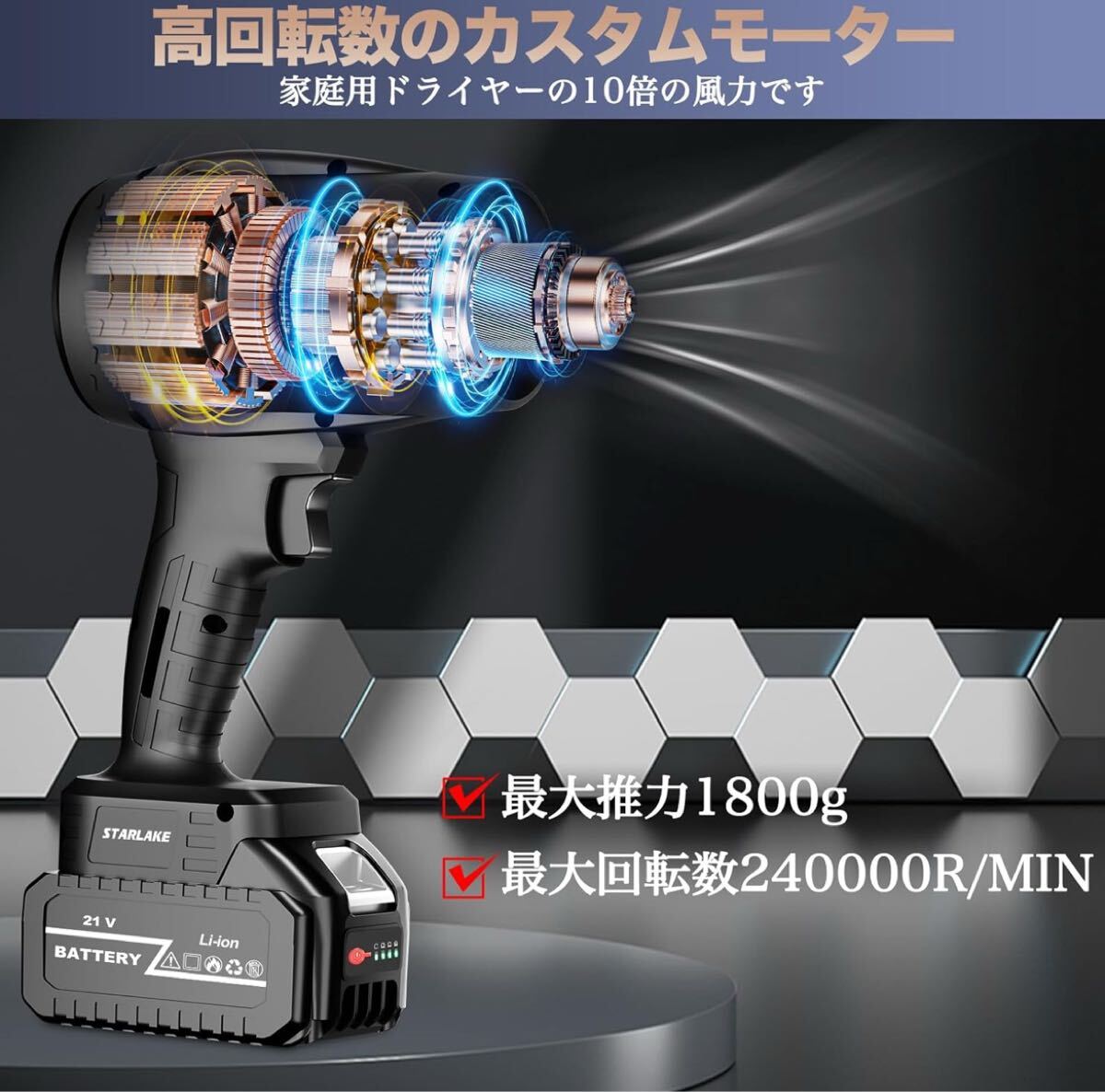■ 最大回転数240000RPM、推力1800gのハイパワー仕様。家庭用ドライヤーの約10倍の風力で、作業効率を大幅に向上。
