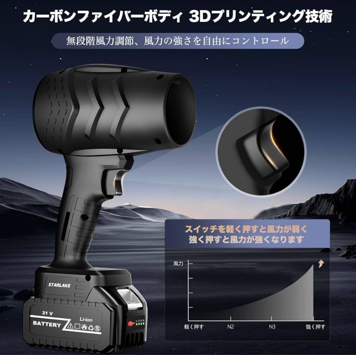 ■ 無段階風量調整式。スイッチの押し込み具合で風量を細かくコントロール可能。弱風〜強風まで用途に合わせて調整できます。