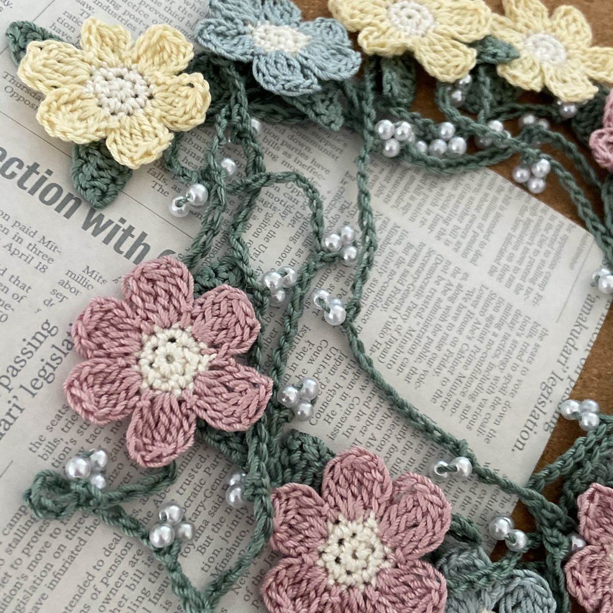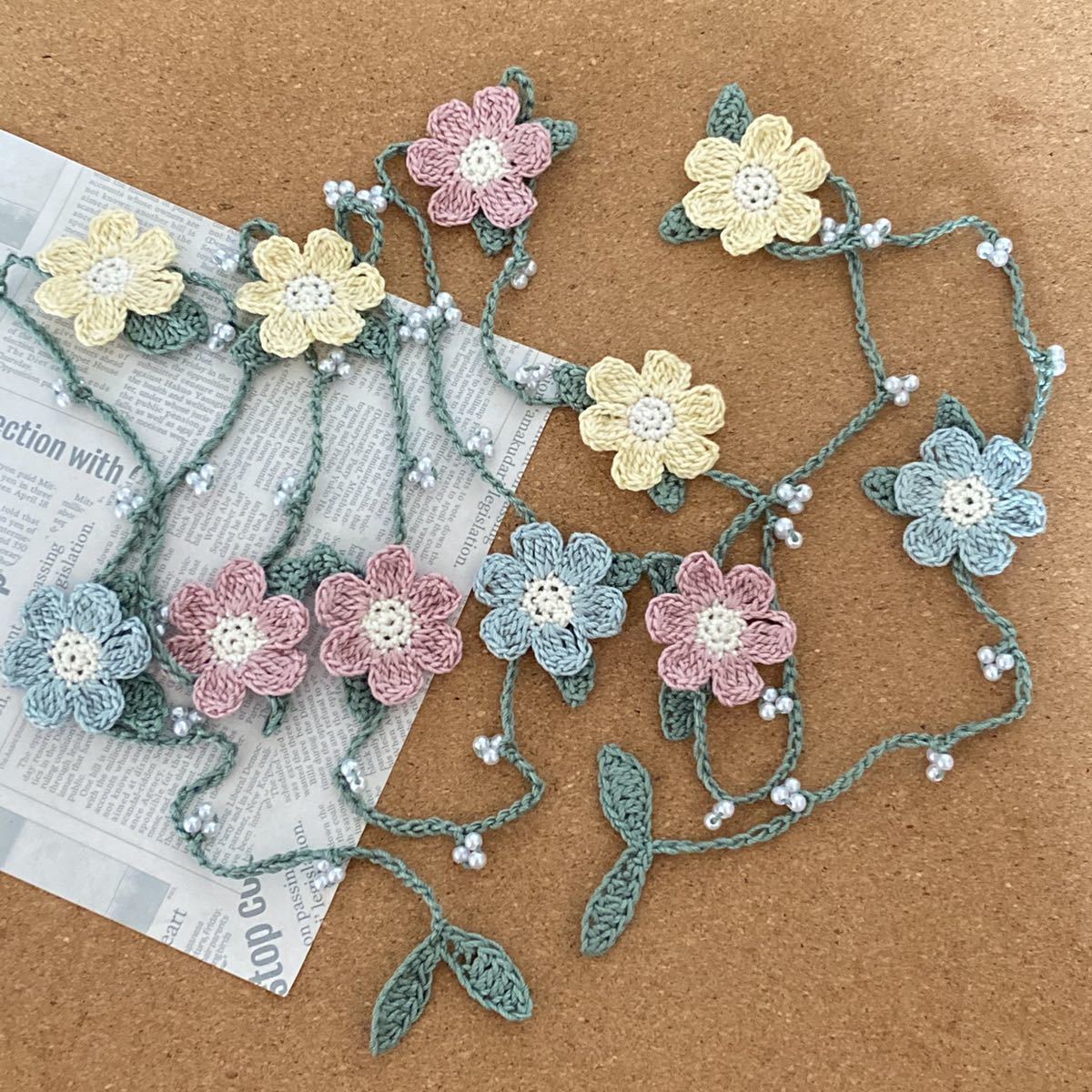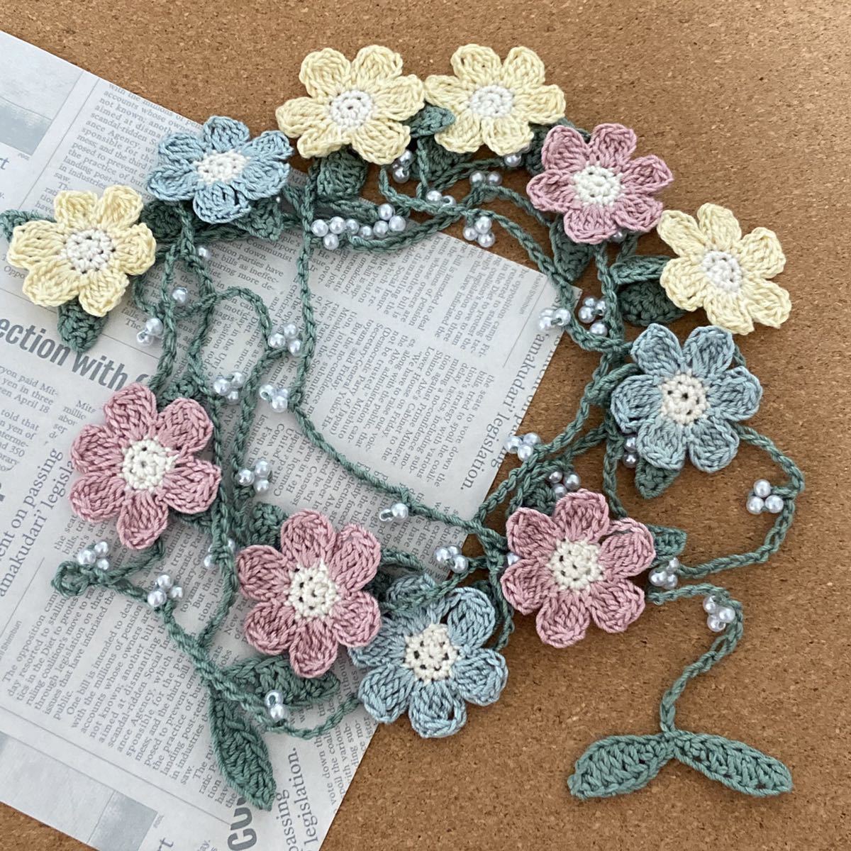 ハンドメイド、くすんだパステルカラーのレース糸で編んだお花のラリエットです。