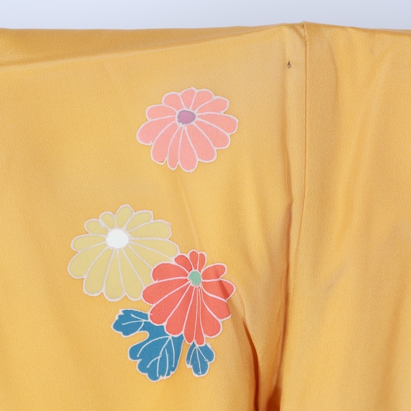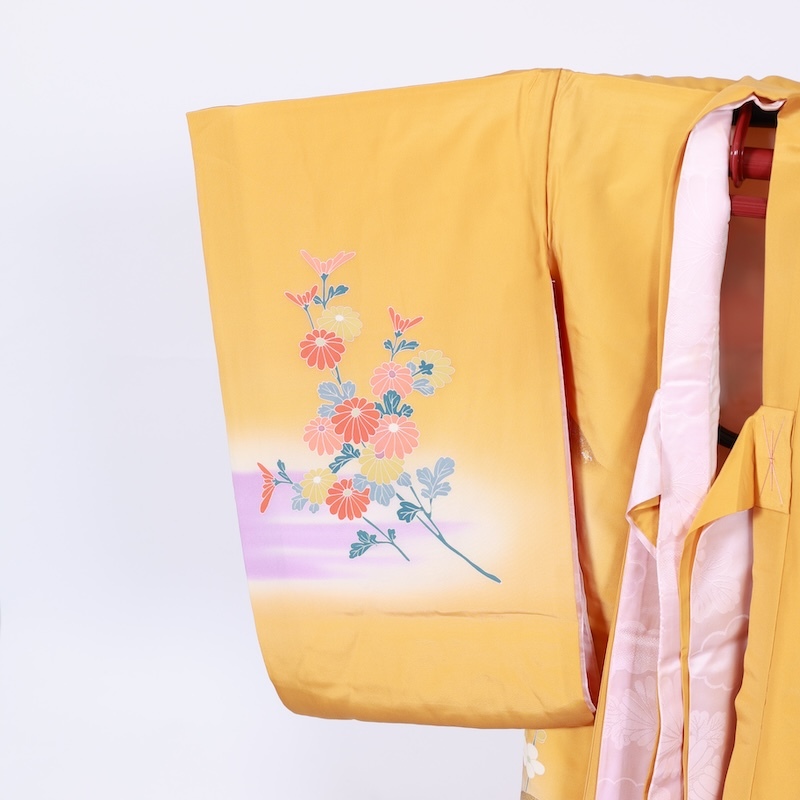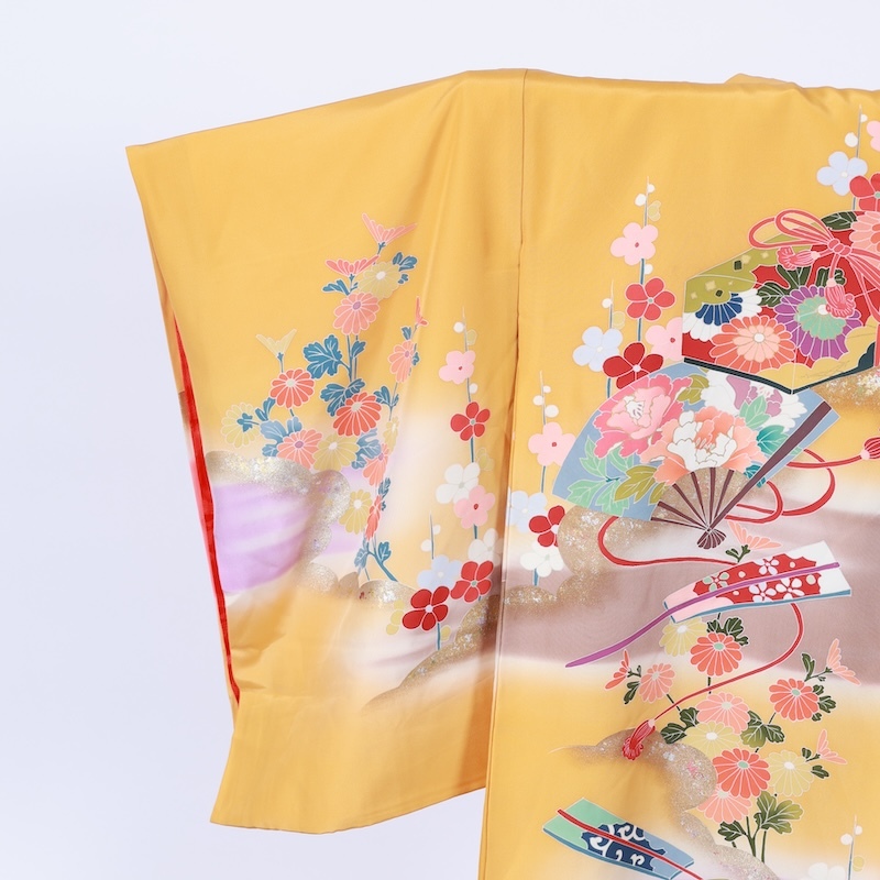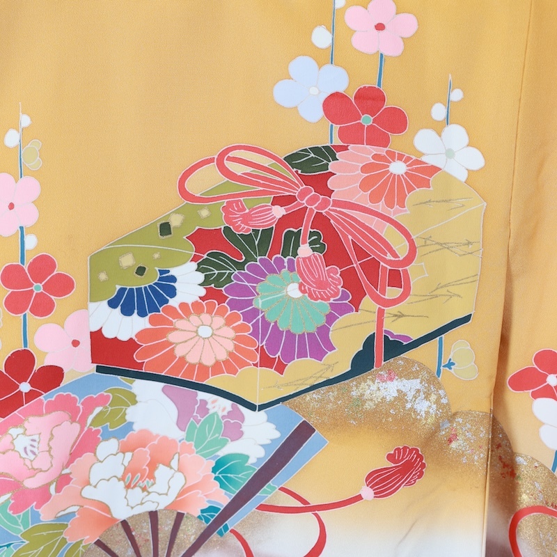 可愛いカラーリングで花、扇、雲取を染め上げた素敵なお品になります。
