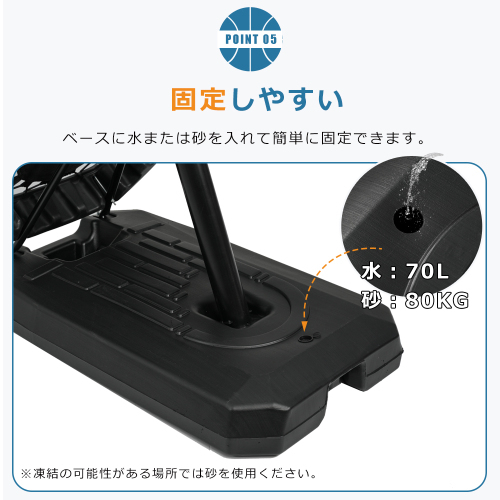 • 【固定しやすい】ベースに水または砂を入れて簡単に固定できます。 水:70L ※凍結の可能性がある場所では砂を使用ください。