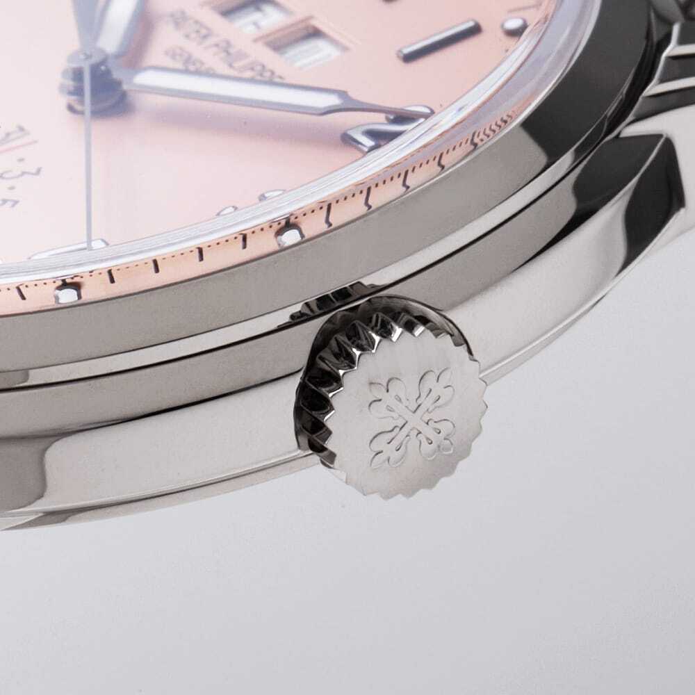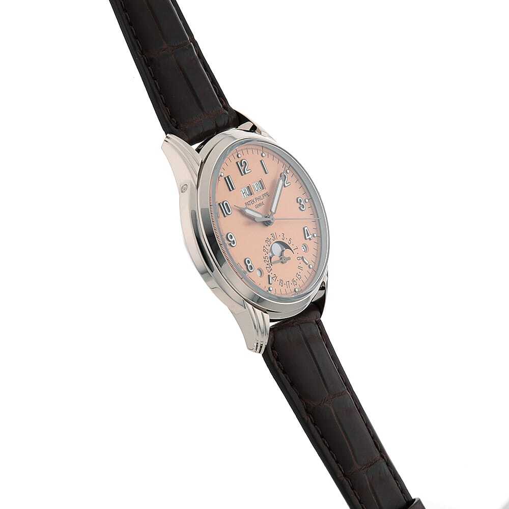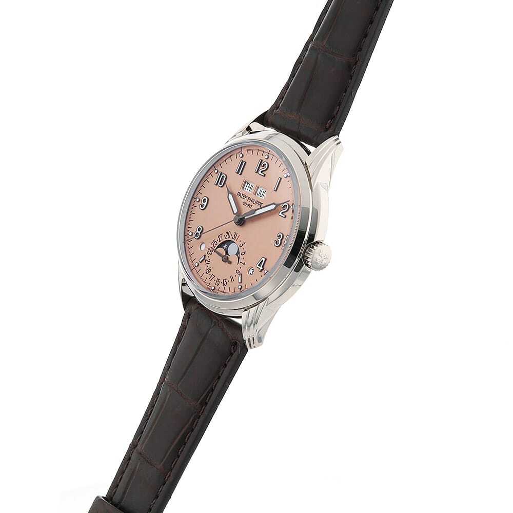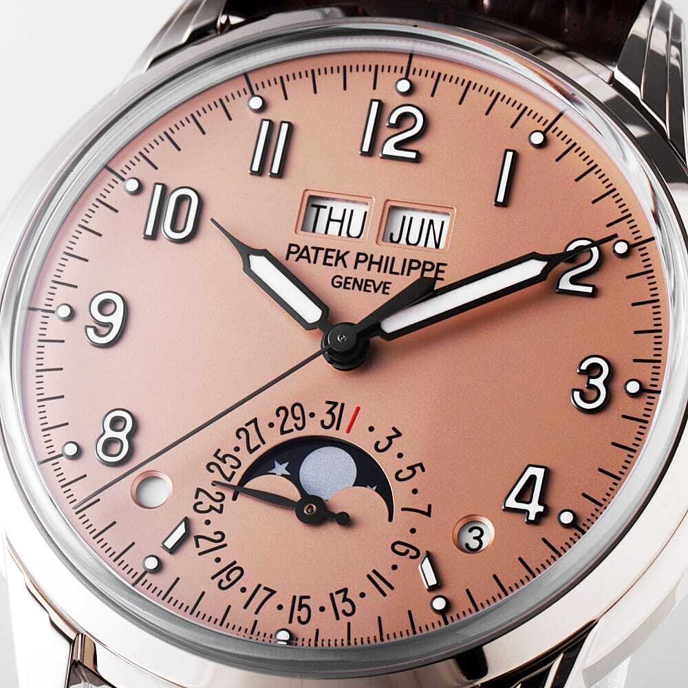 | モデル情報 | 「Ref.5320」に、ローズゴールドめっきのオパーリンダイアルを備えたホワイトゴールド製モデルの登場です。バランスの取れたレイアウトと高い視認性を誇り、ヴィンテージスタイルを現代的に解釈した一本となります。カレンダー表示は、1941年以来パテック フィリップの永久カレンダーに受け継がれる伝統的なレイアウトを踏襲。12時位置には曜日と月を示すダブル・インライン窓、6時位置には日付指針表示とムーンフェイズ表示を配しています。さらに7?8時位置に昼夜表示、4?5時位置に閏年表示を備え、調整時の利便性を向上。ムーンフェイズは極めて高精度に設計されており、122年にわずか1日分の修正を要するのみとなります。クラシックな様式美とヴィンテージスタイルが融合した絶妙な仕上がりのモデルです。 |