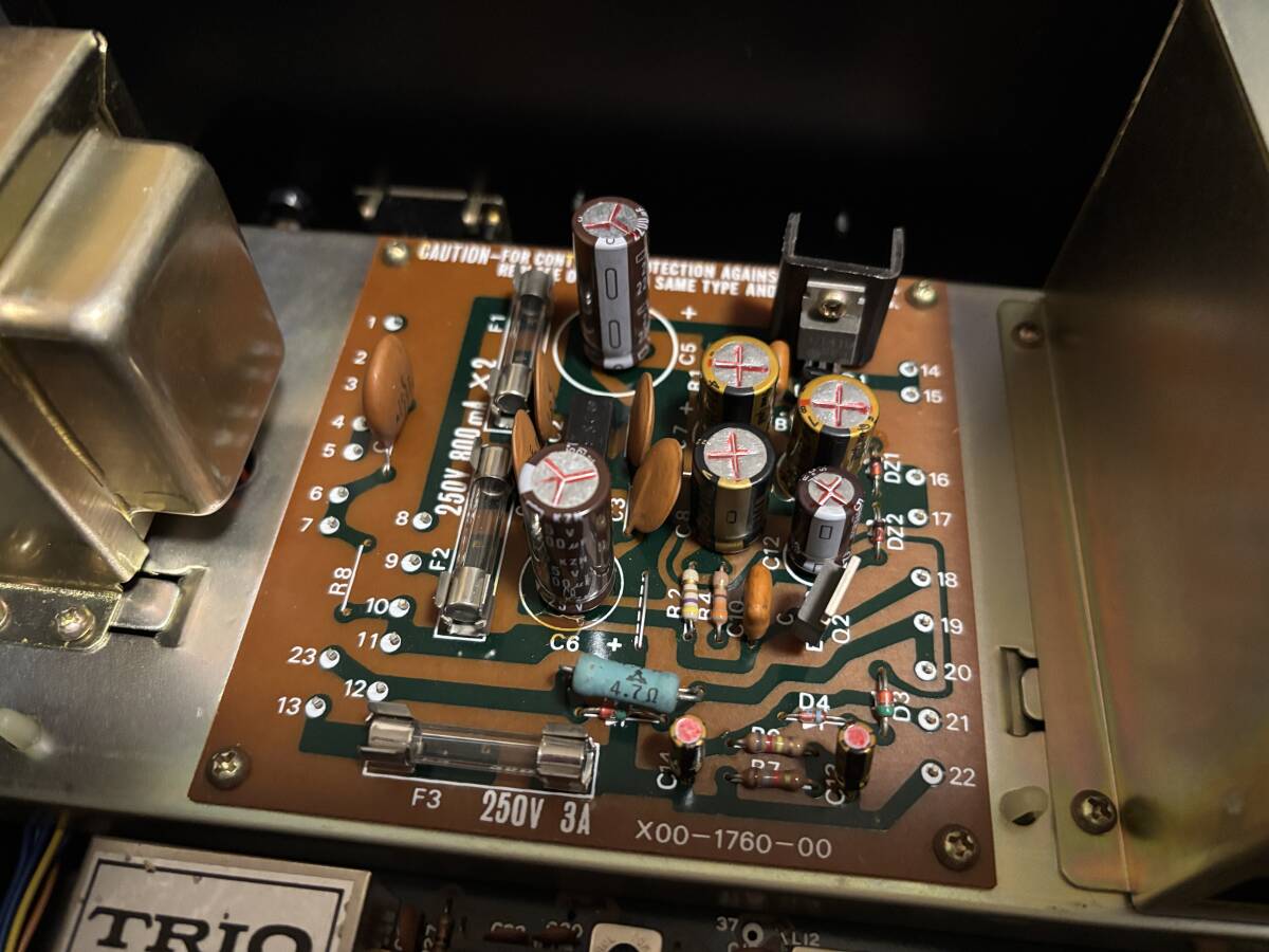 | 音質に関係するところは電解コンデンサーからフィルムコンデンサーに交換。 4個 |