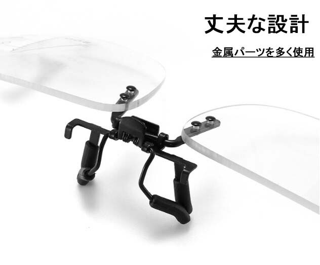 跳ね上げ機能:メガネのかけ外しをせずにレンズ部分を跳ね上げることで、二つの状態を手軽に切り替えられるクリップ式老眼鏡です。
