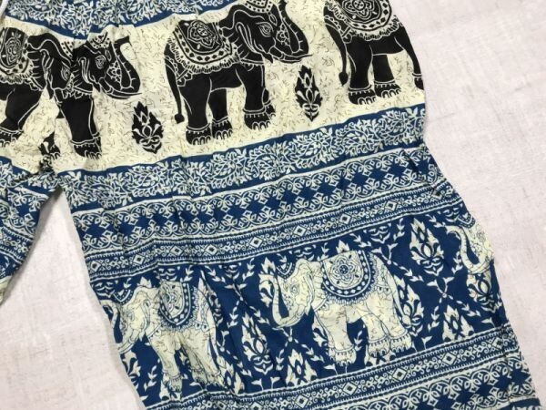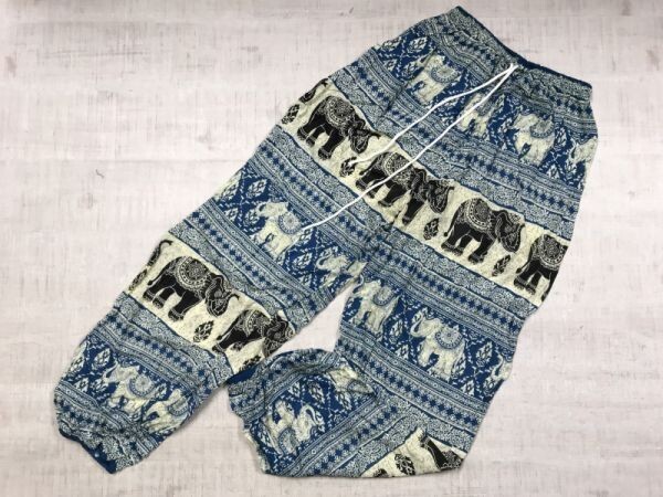 民族エスニック オリエンタル ダマスク ゾウ 総柄 イージー パンツ ボトムス レディース レーヨン100% タイ製 裾ゴム 青 です。