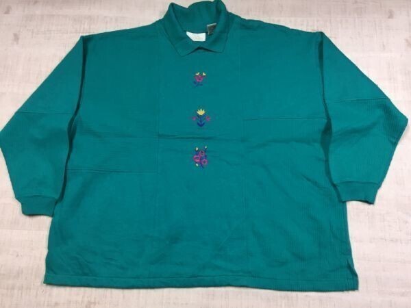 JUST FOR WOMEN オールド レトロ 古着 90s 可愛い お花 刺繍 オーバーサイズ 襟付きスウェットトレーナー レディース 3X 緑