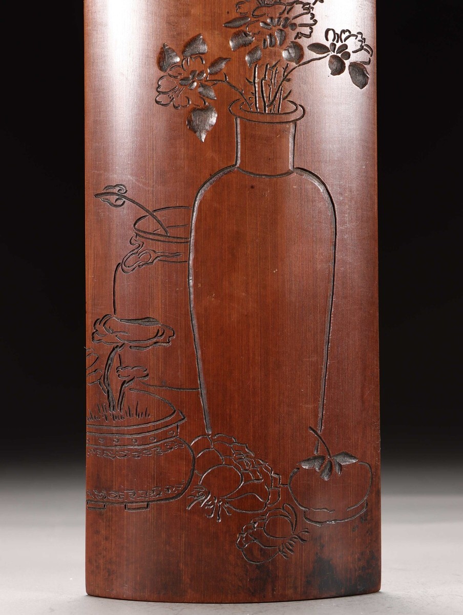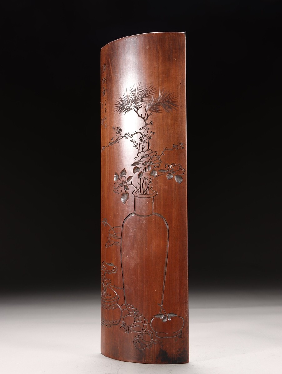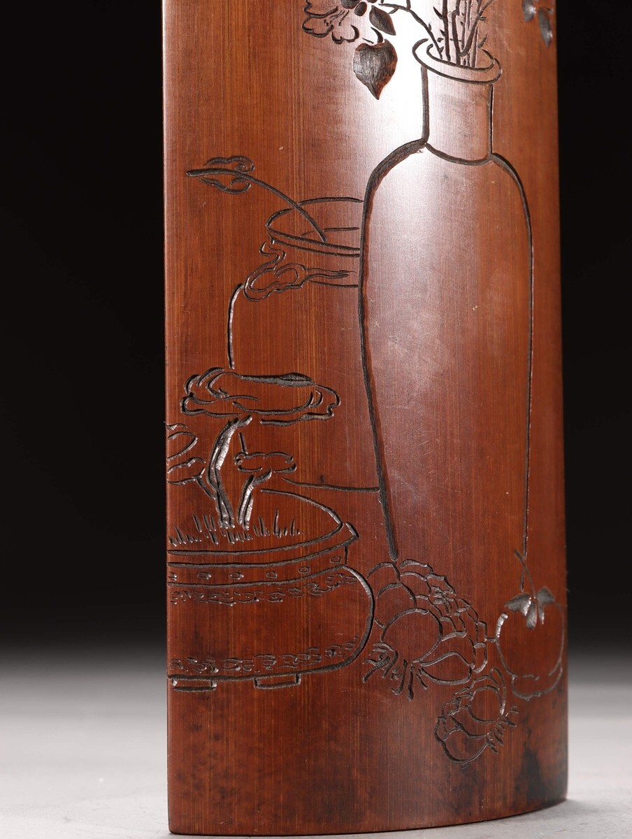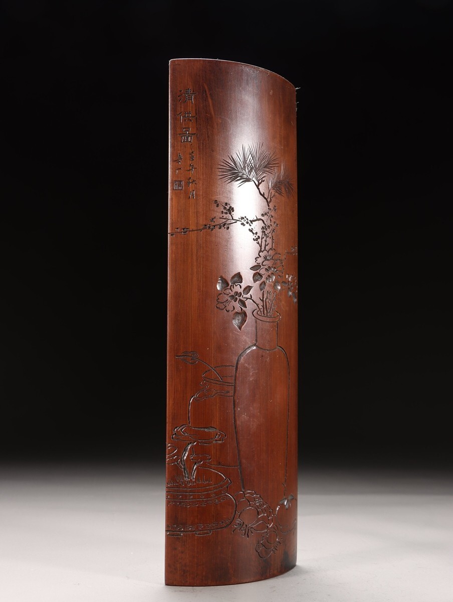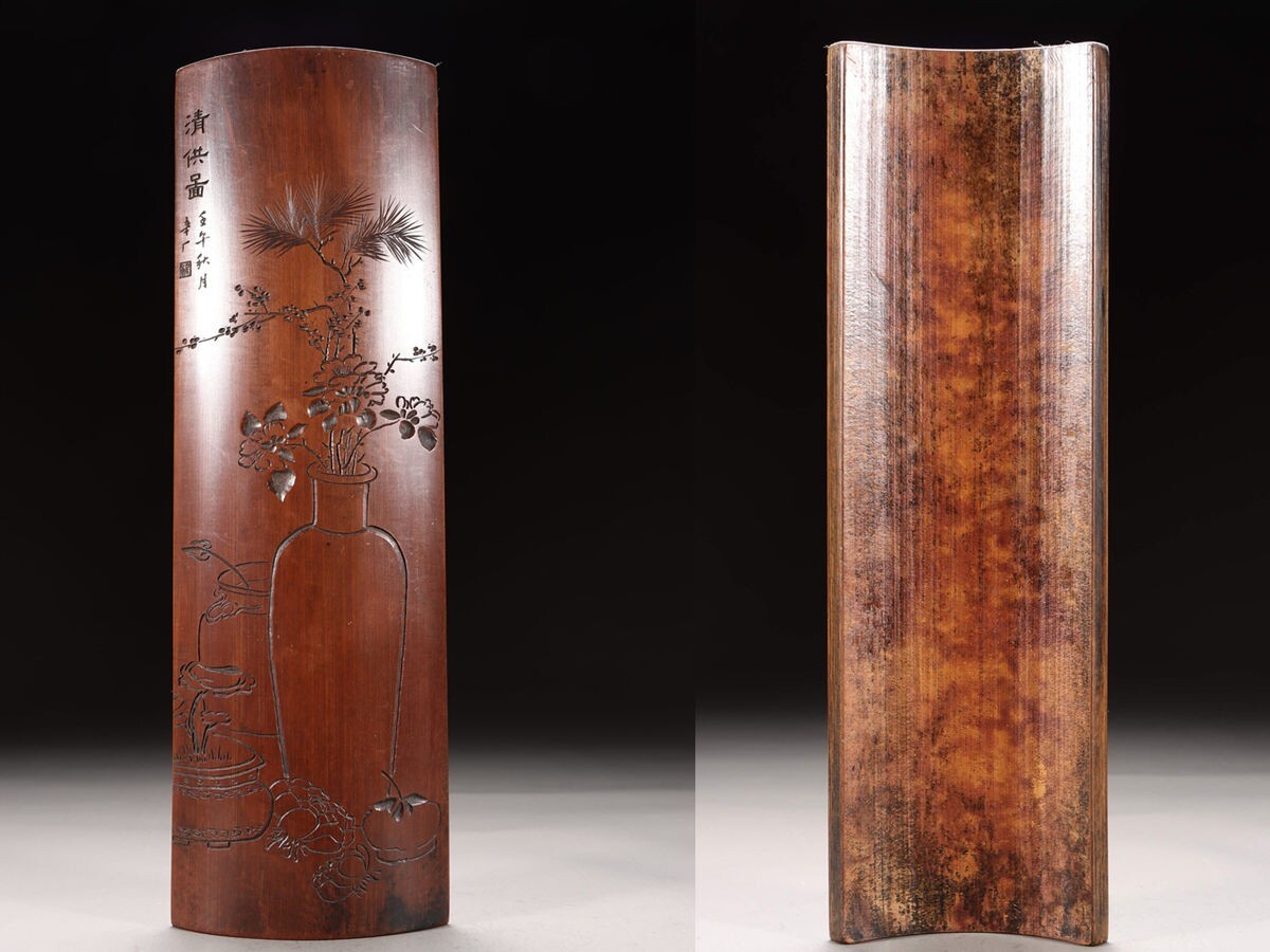 「清時代 老竹 彫り 清供図 茶側 臂擱 在銘」極細工 擺件 賞物 中国古美術 旧蔵出