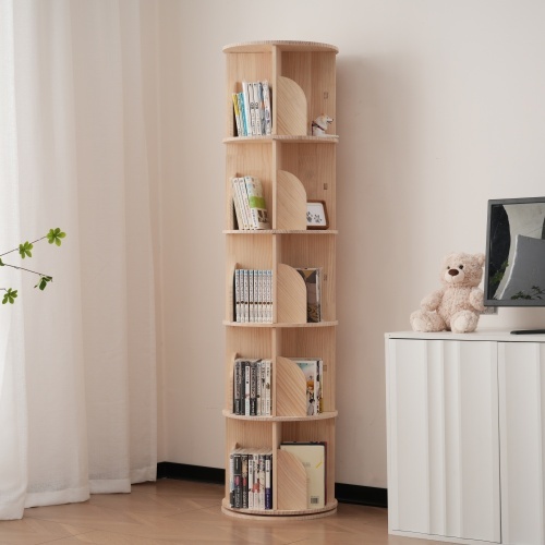 【5段-回転盤タイプ】無垢材 回転式本棚 飾り棚 絵本棚 360°回転本棚 コミック収納棚 本棚 大容量 回転ラック 組立簡単 省スペース