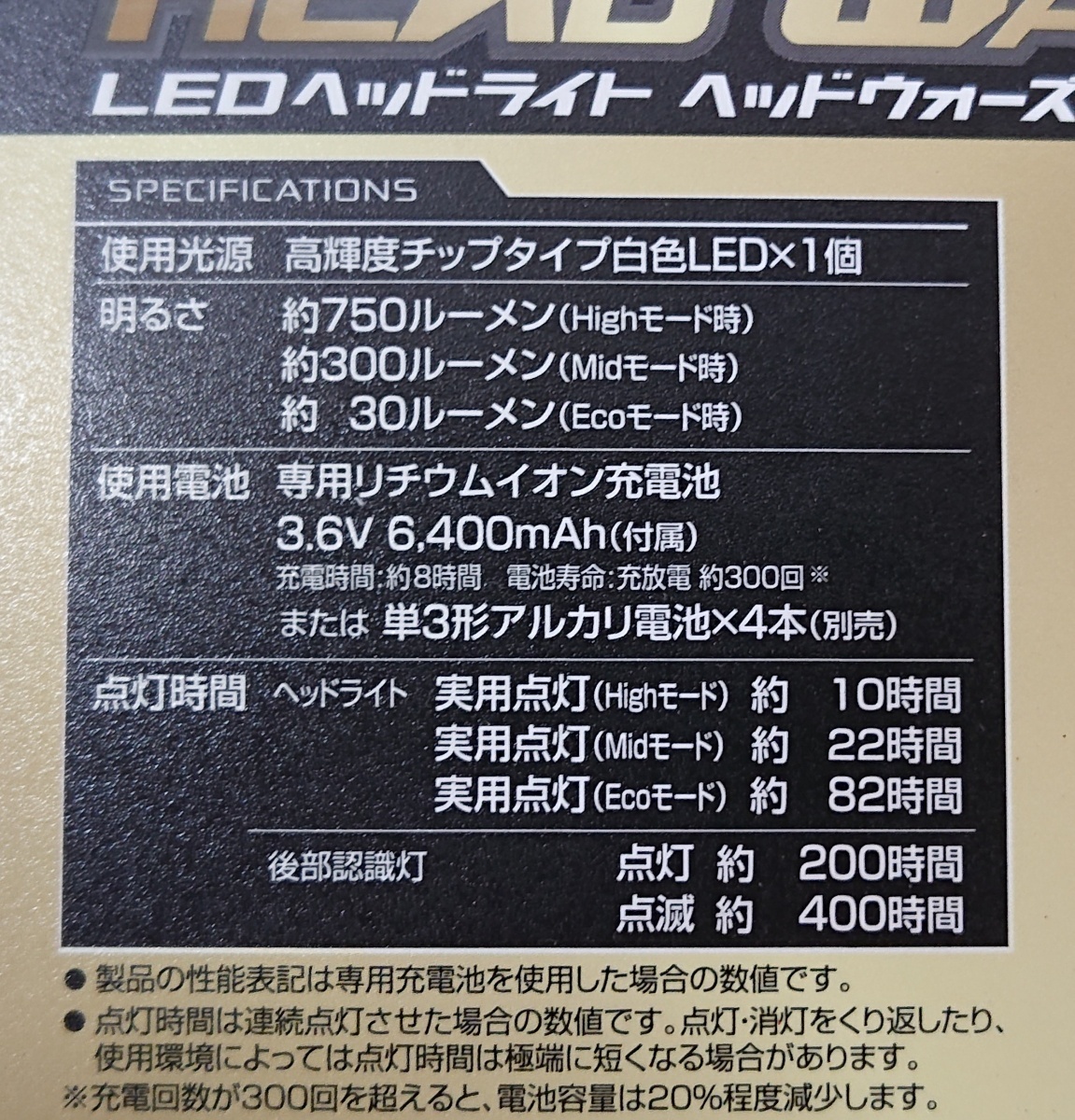 | 商品詳細 | 明るさ:強(750Lm)/中(300Lm)/弱(30Lm) 点灯時間:強(10時間)/中(22時間)/弱(82時間) 点灯パターン:強-中-弱-点滅-Off 使用電池:専用充電池(HW-64SB)または単3アルカリ電池×4本(別売) |