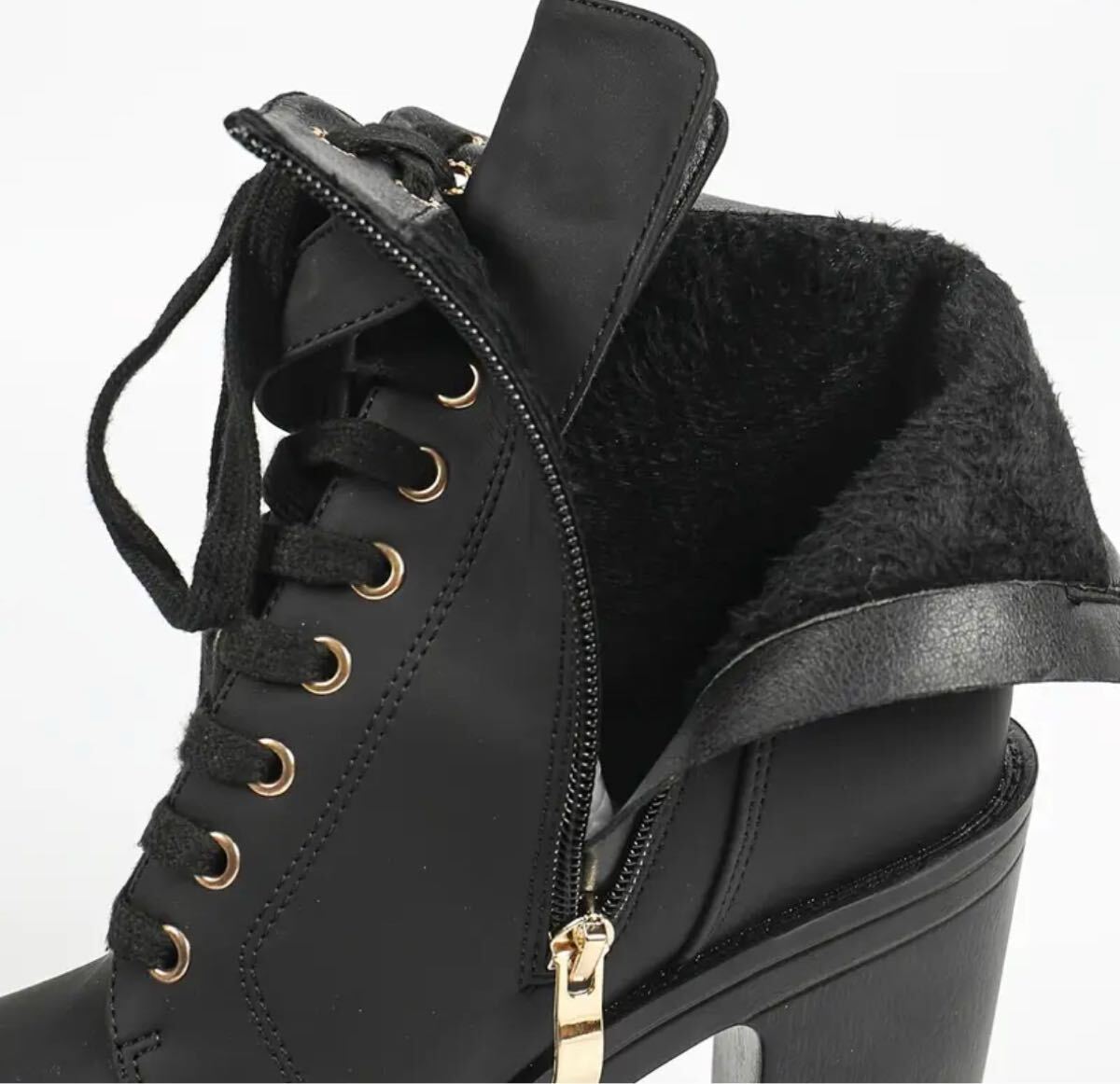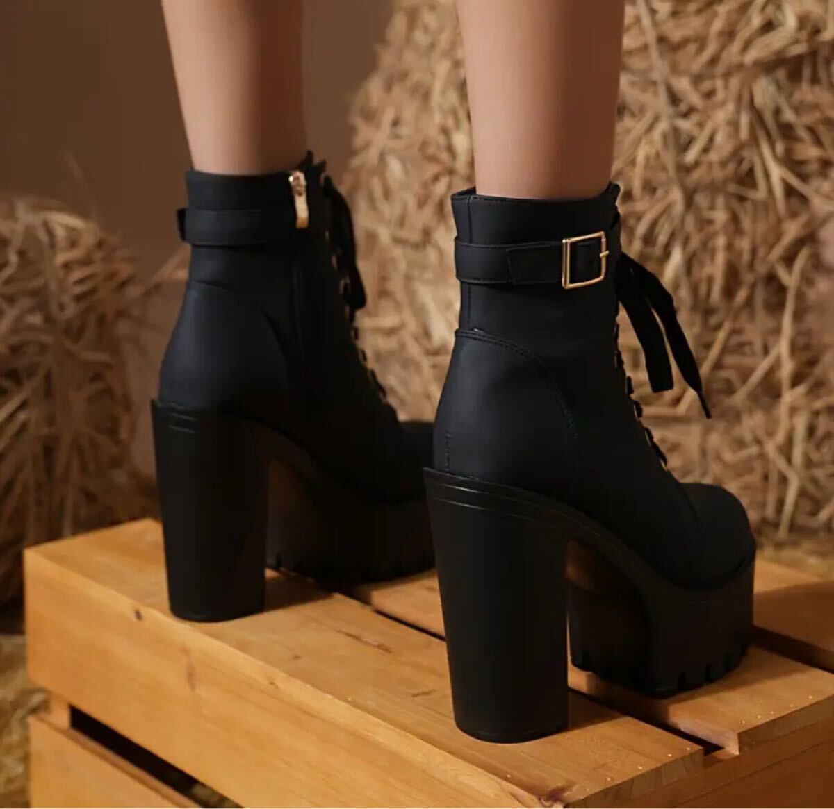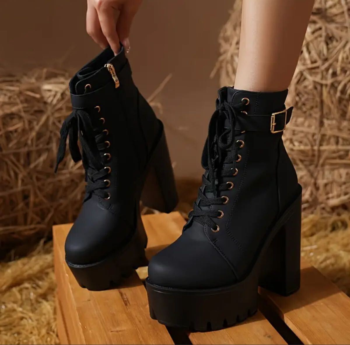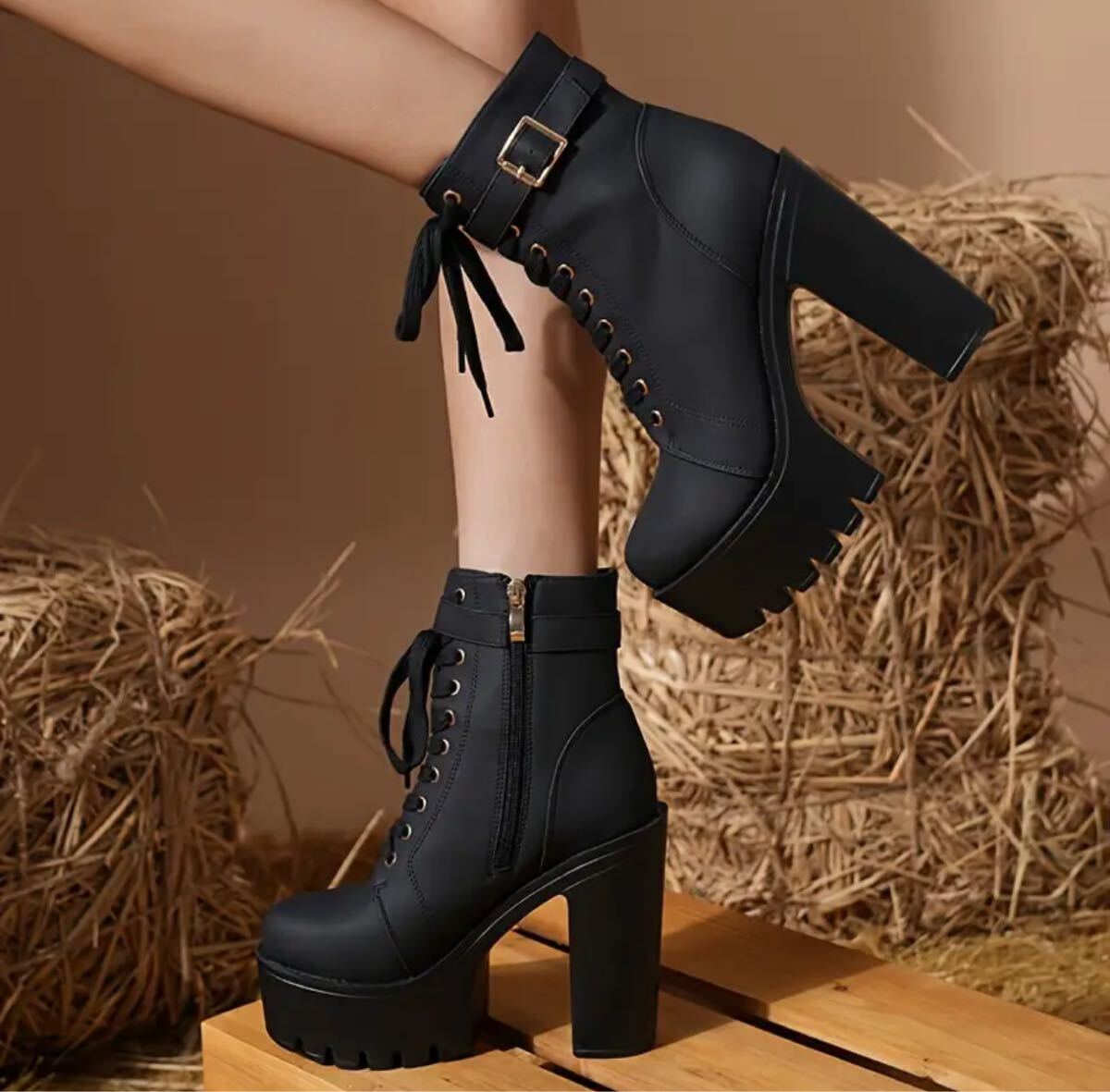 圧倒的な存在感を放つ13cmヒールの厚底アンクルブーツ。ゴツめのメタルバックルとクールなレースアップが、足元から個性を引き立てます。スタイルアップを叶えながら、トレンド感も手に入る一足です。
