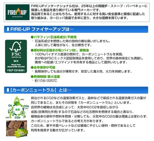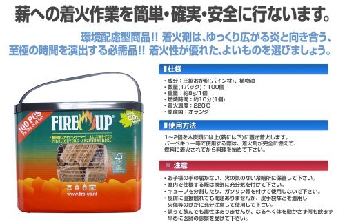 1バケット・ 541142・・Style:1バケット・[成分]圧縮おが粉(パイン材)、植物油・[入数] 100個入り・[形状]バラ・[燃焼時間]約10分/個・[着火温度]約220℃[特徴] ■燃焼時の嫌な臭いがしない パラフィン(石油系成分)を燃焼した時の独特の嫌な臭いがしません。 人体に対して毒性が無く、生分解性です。 ■原材料は圧縮おが粉(パイン材)、植物油 100%バイオマス資源の燃焼でカーボンニュートラルを実現。 おが粉はFSCミックス認証取得品を使用しており、世界の森林保全に貢献し、環境への配慮(エコマインド)を共有する製品として提供します。 ■永年保存が可能 長期保存しても油分が揮発せず、安定した着火性、火力を維持します。 【使用方法】 1~2個を木炭類には上(薪には下)に置き着火します。 バーベキュー等で使用する際は、着火剤が完全に燃えて、燃料に着火されてから料理を始めて下さい。 ※注意※ ・お子様の手の届かない、火の気のない冷暗所に保管して下さい。 ・室内で仕様する際は換気に充分気を付けて下さい。 ・キューブを分割したり、ガソリン等を付けて使用しないで下さい。 ・皮膚に直接触れても問題ありませんが、皮手袋などを着用し火傷等のけがに充分注意して使用して下さい。 ・誤って飲んでも毒性はありませんが、なるべく体を動かさず何も飲まず早めに医師の診察を受けて下さい。 [ブランド]FIRE-UP(ファイアーアップ) [FIRE-UPインターナショナル社とは ] 25年以上の間、暖炉・ストーブ・バーベキューに関連した製品を造り続けているいる専門メーカーです。 高品質であることはもちろん、使用する人に対する高い安全基準と環境に配慮した取り組みは、ヨーロッパ各地で永年に亘り大きな信頼を得ています。