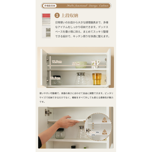 • 【空間を最大限に活用、理想の収納を実現】幅59cmのスリムなフォルムで、限られたスペースを無駄なく活用します。コンパクトなのに大容量だから、食器やストック食材、家電製品——キッチン周りのあふれがちなアイテムも、用途に合わせてすっきりと収納します。
