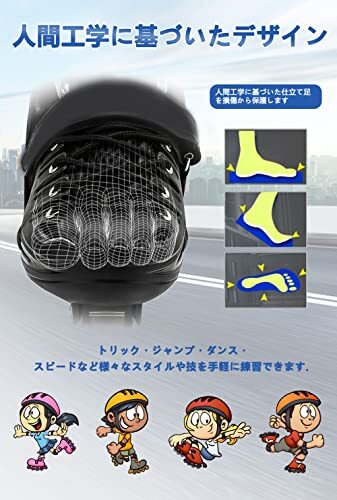【安定性に優れた&人間工学に基づいたデザイン】 インラインスケートのフレームは、軽くて丈夫なアルミニウム合金でできて、丈夫で耐久性に優れた。また、人間工学に基づいたデザインは、足の形にフィットし、長い時間滑っても足が痛くならないです。