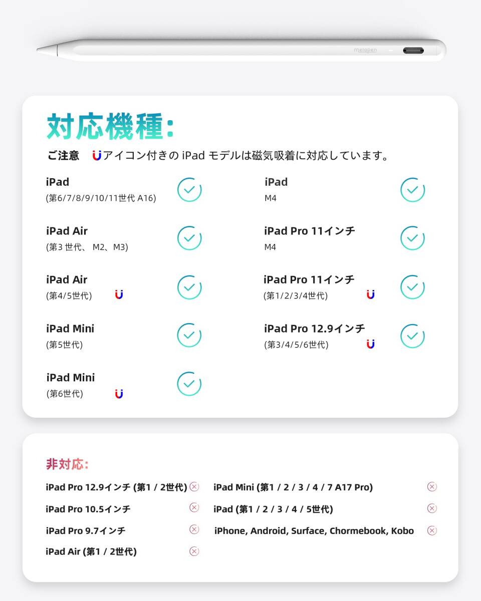 【2018年以降のiPad専用タッチペン】Metapen A8は、2018以降のiPadモデルに最適なコンパニオンです:iPad 第6/7/8/9/10/11世代、iPad Air 第3/4/5/6/7世代、iPad Pro 11インチ第1/2/3/4世代、iPad Pro 12.9インチ 第3/4/5/6世代、iPad Mini第5/6世代、 iPad Pro 13/11 inch(M4)、iPad Air 13/11 inch(M2)。アップルペンシルの最高な選択です。ご注文の前にデバイスを確認してください、他のモデルは無効です。