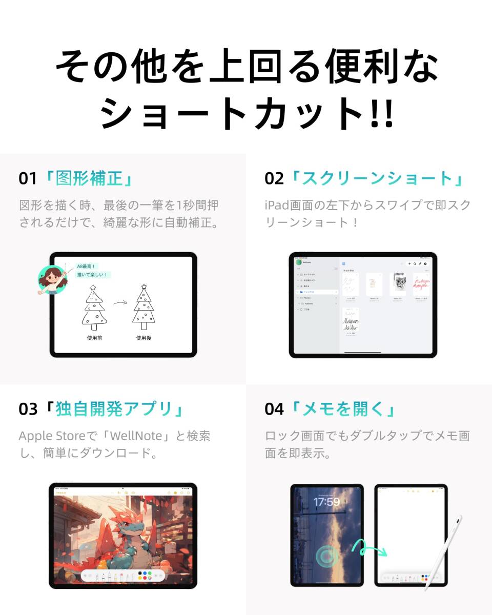【使いやすさ& パームリジェクション& 磁気吸着機能】メタペン iPad ペン A8は、複雑なBluetoothペアリングが不要で、ペンの頭を2回タッチするだけで、すぐに使えます。パームリジェクション機能を搭載しており、デバイスの画面に手を置くことができ、長時間の作業でも腕が疲れません。磁気吸着機能があり、紛失を防ぎ、iPad側面にピタっとっついて収納・持ち運びに便利です。ご注意:磁気吸着機能対応: iPad Pro 12.9"、iPad Pro 11"、iPad Air 第4/5世代、iPad mini第6世代。磁気吸着機能非対応: iPad Pro 13/11 inch(M4)、iPad Air 13/11 inch(M2)、iPad第6/7/8/9/10世代、iPad Air第3世代、iPad Mini第5世代。