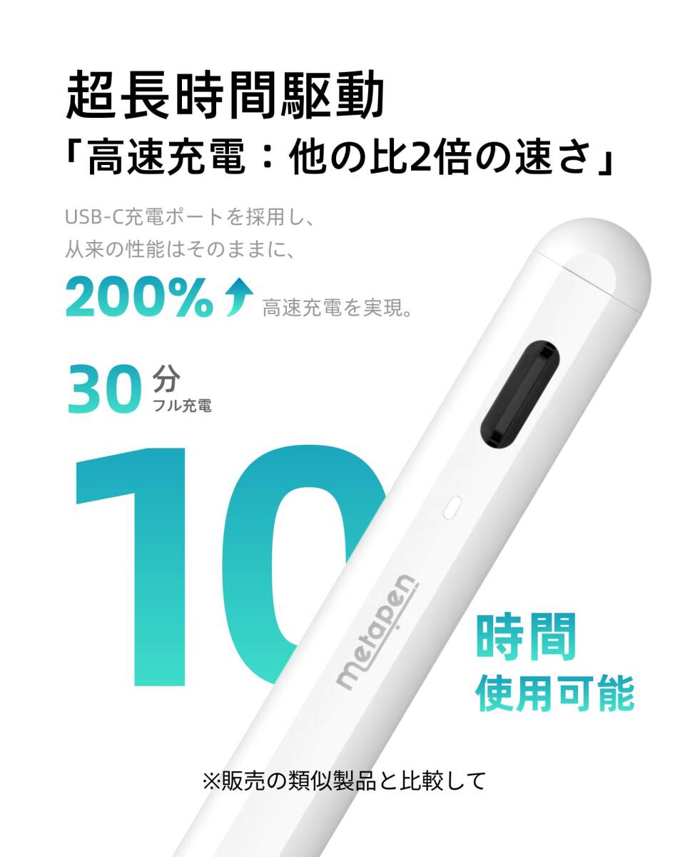 【Type-C高速充電& 長時間使用】Metapen iPad用 タッチペン A8は、充電1分で50分、充電4分で2時間使用できます。30分間フル充電でき、10時間連続使用可能になります。5分間静置し、スマートに電源を切り忘れないようにし、電力を節約します。Metapen A8の高速充電とバッテリー寿命を楽しんでください、バッテリー切れの心配はありません!