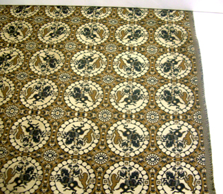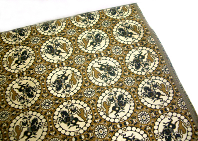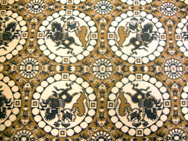 ●獅子狩文様は、サザン朝ペルシャを代表する狩猟文様で、連壁円文の中に翼をもつ駿馬に乗った騎士が、飛びかかる獅子を射ようとしている様子を織り上げています