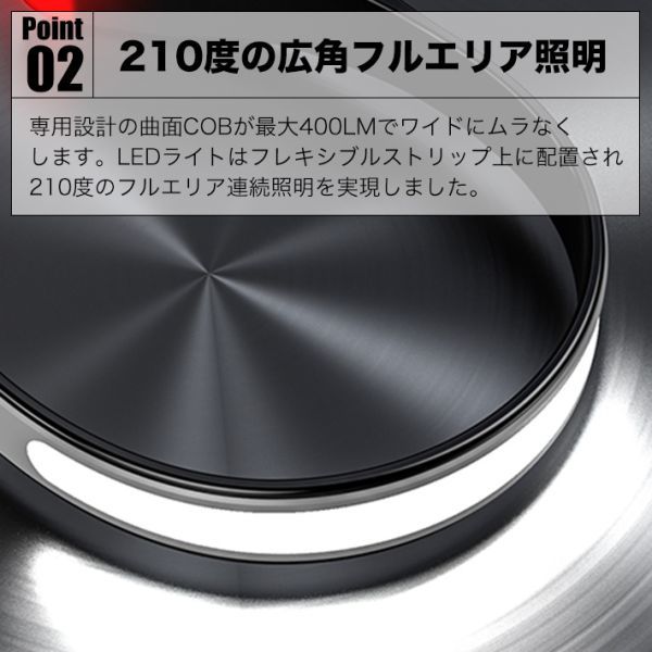 210度広角LEDヘッドランプです。専用設計の曲面COBが最大400LMでワイドにムラなく照射します。LEDライトはフレキシブルストリップ上に配置されて210度のフルエリア連続照明を実現しました。