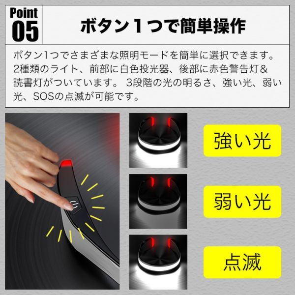 ボタン1つでさまざまな照明モードを簡単に選択できます。2種類のライト、前部に白色投光器、後部に赤色警告灯&読書灯がついています。 3段階の光の明るさ、強い光、弱い光、SOSの点滅が可能です。