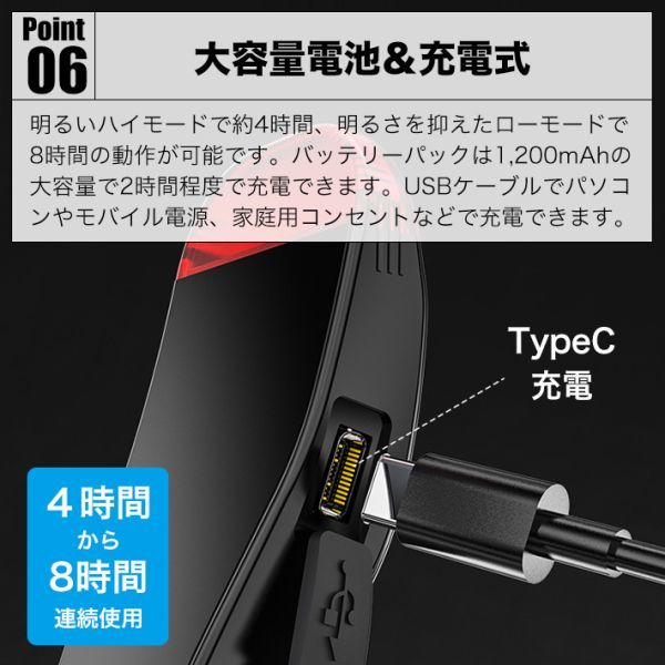 より明るいハイモードで約4時間、明るさを抑えたローモードで8時間の動作が可能です。このバッテリーパックは1,200mAhの容量を内蔵し、2時間程度で充電が可能です。USBケーブルでパソコンやモバイル電源、家庭用コンセントなどに接続することで、本製品を充電することができます。