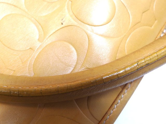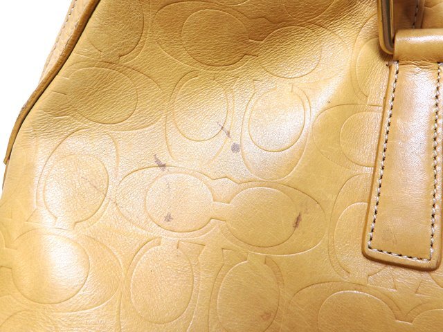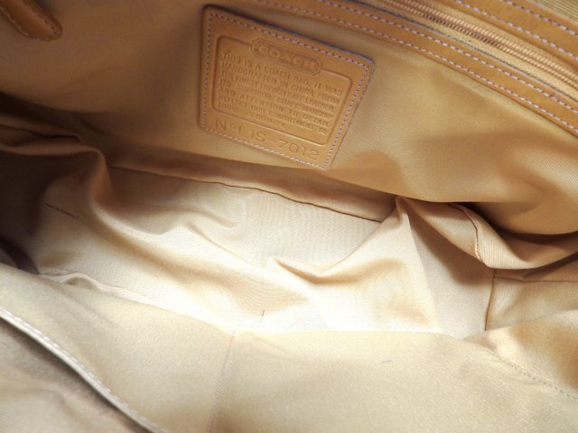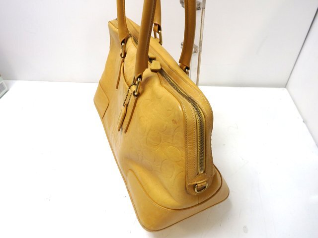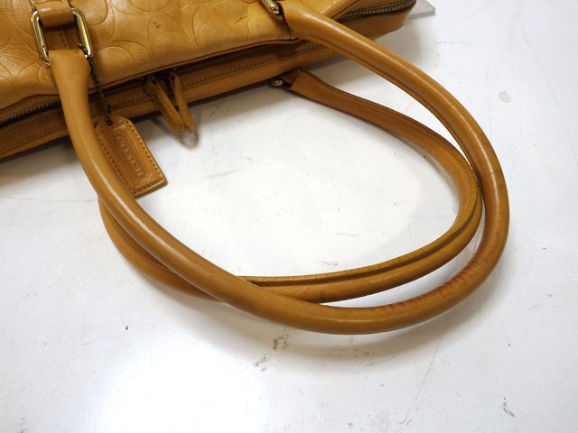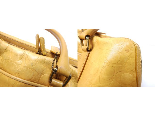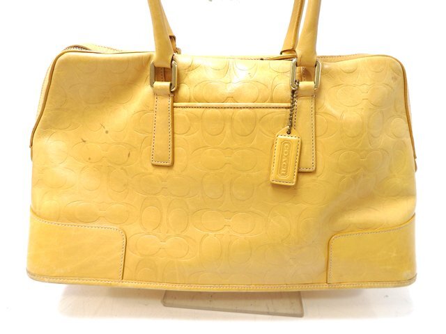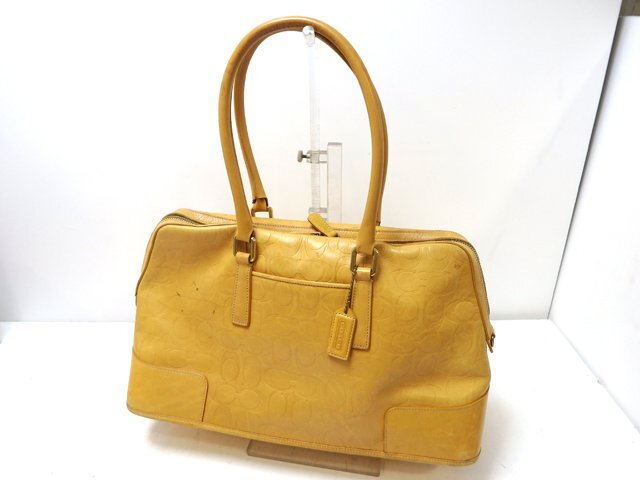 ブランド:COACH (コーチ) ライン :シグネチャー 型 番 :L1S-7012 サイズ :約 幅38cm×高さ22cm×マチ幅16cm カラー :マスタードイエロー 金具ゴールド 素 材 :キャンバス レザー 仕 様 :ハンドバッグ キャリーオール ファスナー開閉 ポケット×4 付属品 :本体のみ こちらのお品は【 中古 】となります。 経年による革の硬化、濃いめのシミが数か所見受けられるほか フチ擦れ、全体的な擦れ、ヤケ・変色、金具塗装剥げ 等の使用感が生じているお品です。 ファスナーの動きが少々スムーズではない感じがあります。ショルダーストラップは欠品しています。 別途:その他、いろいろ出品しています |