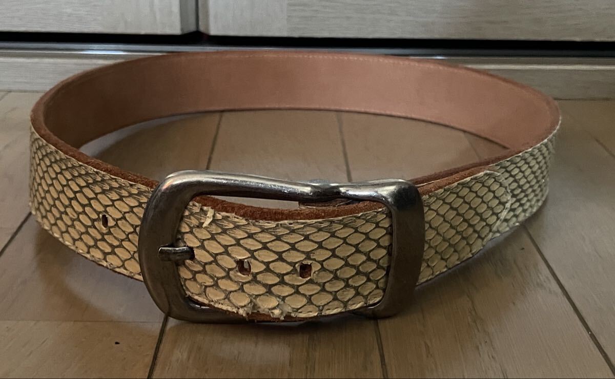 本革のギャリソンベルトです。パイソンレザー部分も、ウロコ状ですので、リアルレザーかと思われます。カラーはホワイト×ナチュラルです。 表記サイズはM。サイズ等詳細は画像をご参照願います。使用感、小傷、ウロコのめくれ等ございますが、目立つダメージはございません。あくまで個人保管品です。見落としがあることもございますので、細かい点を気になさる方からの入札はお断りさせていただきます。発送は本州であれば、690円で可能です。レターパックも可能です。落札後のキャンセルは一切お断りさせていただきますので、ご不明な点等は何なりとご質問下さいませ。