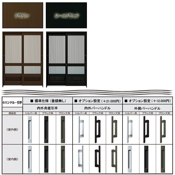 | ■ ハンドル仕様 | ■内外舟底引手 室外側:引手/室内側:引手 (基本仕様) 追加差額無し ------------------------------------------------------------------------- ■外側バーハンドル 室外側:バーハンドル/室内側:引手 (+12,000円) ■内外バーハンドル … 室外側:バーハンドル/室内側:バーハンドル (+21,000円) |