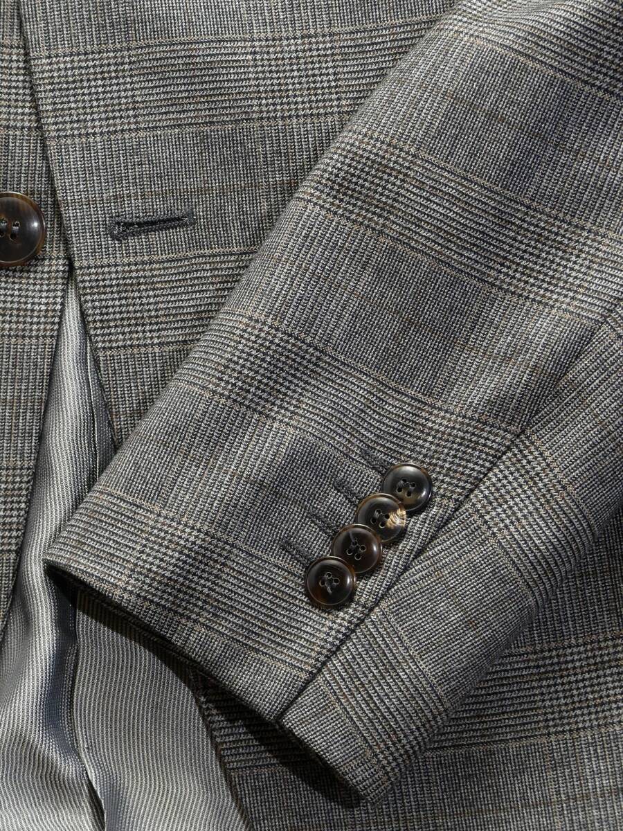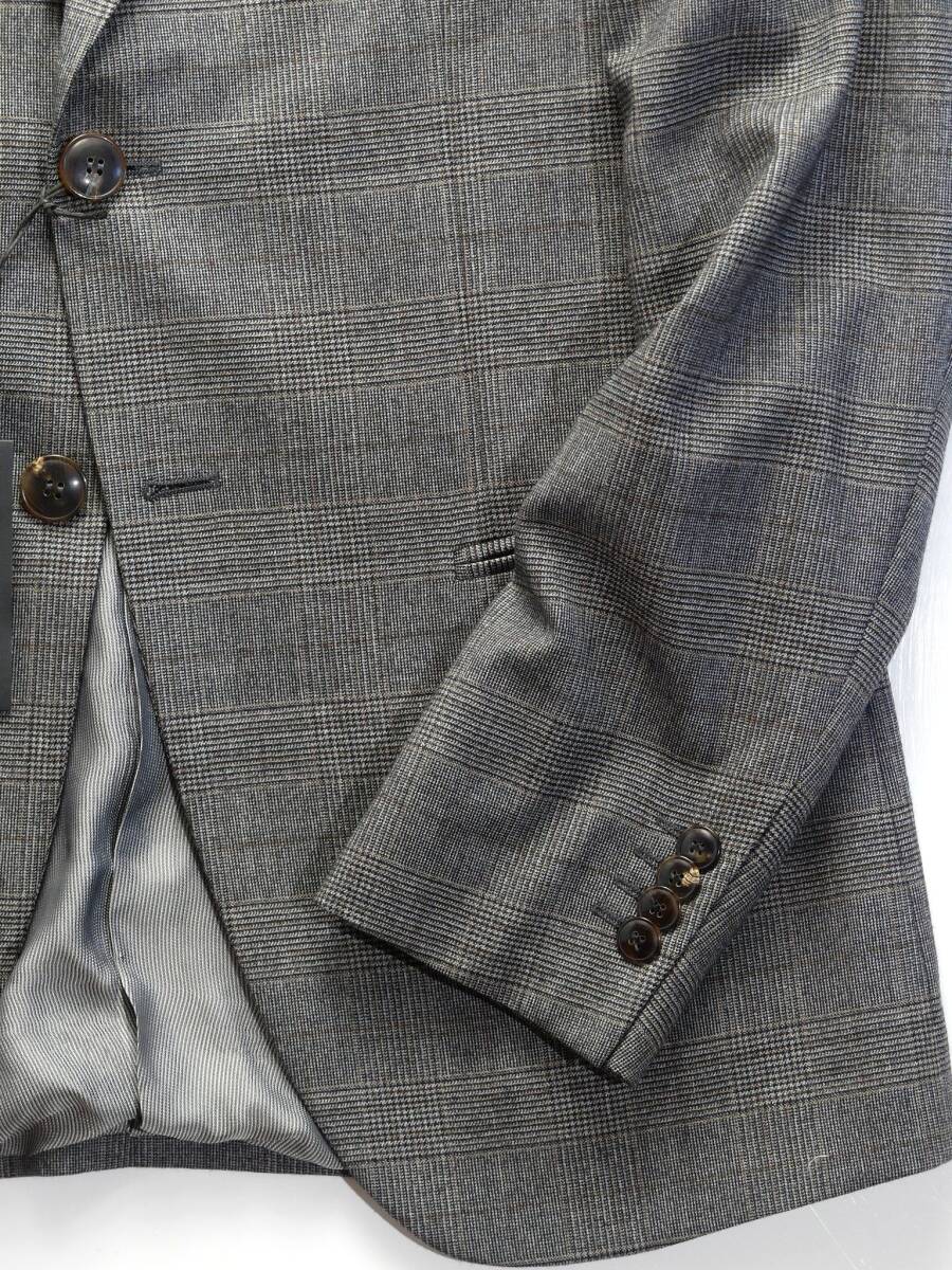 イタリア最高職人の仕立てテクニックが裏地の縫い上げ部分にも見られる、ジョルジオの最高級テーラードジャケット。今回のお品は「GEORGE ジョージ」ライン。ジョージラインは前身ごろをキャンバス地で形成した本格テーラードシリーズ。胸から上、肩にかけて薄手のパッドを入れることで、ナチュラルでありつつ構築感のある美しいシルエットを実現。首裏の生地たるみ、背中側袖付け部の遊びも無い、完璧にフィットする立体的な仕立てが特徴です。さらにしなやかな最高級生地を使うことで、マージンを省いたシビアなスタイリングを実現しています。生地は定番人気のプリンス・オブ・ウェールズ。一生物にふさわしい王道かつベーシックなブレザーです。秋冬向けの少し起毛質感ふっくらタイプ。着用スタートは10月下旬から。4月に入るころまでが着用シーズンのお品になります。