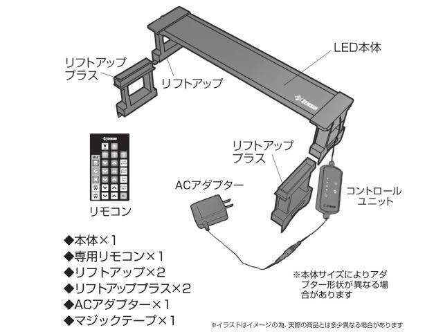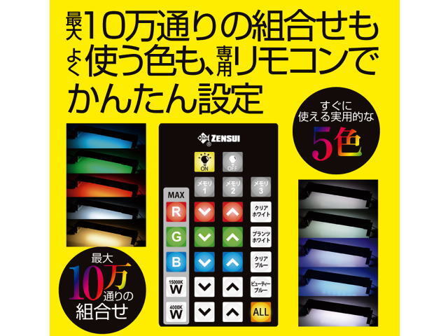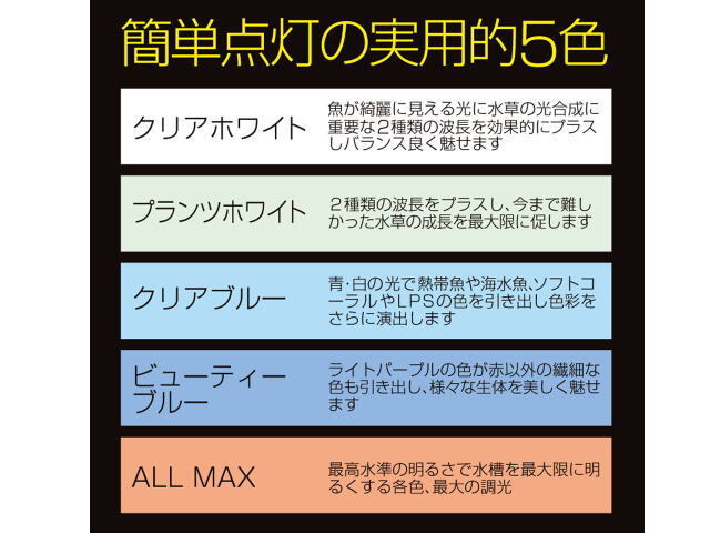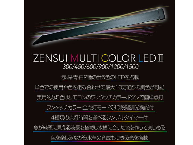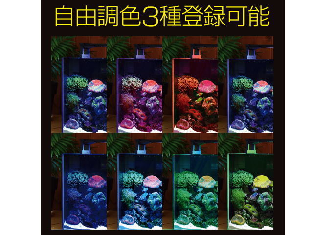 商品名:ゼンスイマルチカラーLEDII 900 ・赤、緑、青、白2種の5色のLEDを搭載 ・単色での使用はもちろん、組み合わせれば最大10万通りの調色が可能 ・実用的な5色はリモコンのワンタッチカラーボタンで簡単点灯 ・ワンタッチカラー全点灯モードの10段階調光機能付 ・4種類の点灯時間を選べるシンプルタイマー付 ・魚が綺麗に見える波長を搭載し水槽に合った色を作って楽しめる ・色を楽しみながら水草の育成もできる光を搭載 ■魚が綺麗に見える光 金魚、ネオンテトラ、アロワナ、ディスカス、海水魚、サンゴetc・・・ 三原色の光が織り成す色で今までとは違う魅力的な色合いの水槽が 楽しめます。生体の色に合わせた色をお選びください。 ■水草育成向きの波長 水草の育成に効果的な光を含む波長域を搭載。 水草育成に充分な光量もあり初心者の方でも 魚の観賞と共に水草の育成を楽しめます。 →詳しくはこちら ■商品仕様 電圧全国共通 サイズ:W900xD68xH24mm 適合水槽:90cm水槽 重量:485g 電源アダプター:入力AC100V、出力DC24V1500mA IP規格:IP66 定格消費電力:36W (全灯MAX点灯時) 全光束ルーメン:2700lm (全灯MAX点灯時) 色温度ケルビン:7000k (全灯MAX点灯時) 演色性Re:94 電気代目安1ケ月::約270円 ※水中での使用はできません。 ※稼働時間1日10時間x30日(1Kwh=25円)全点灯時で計算 |