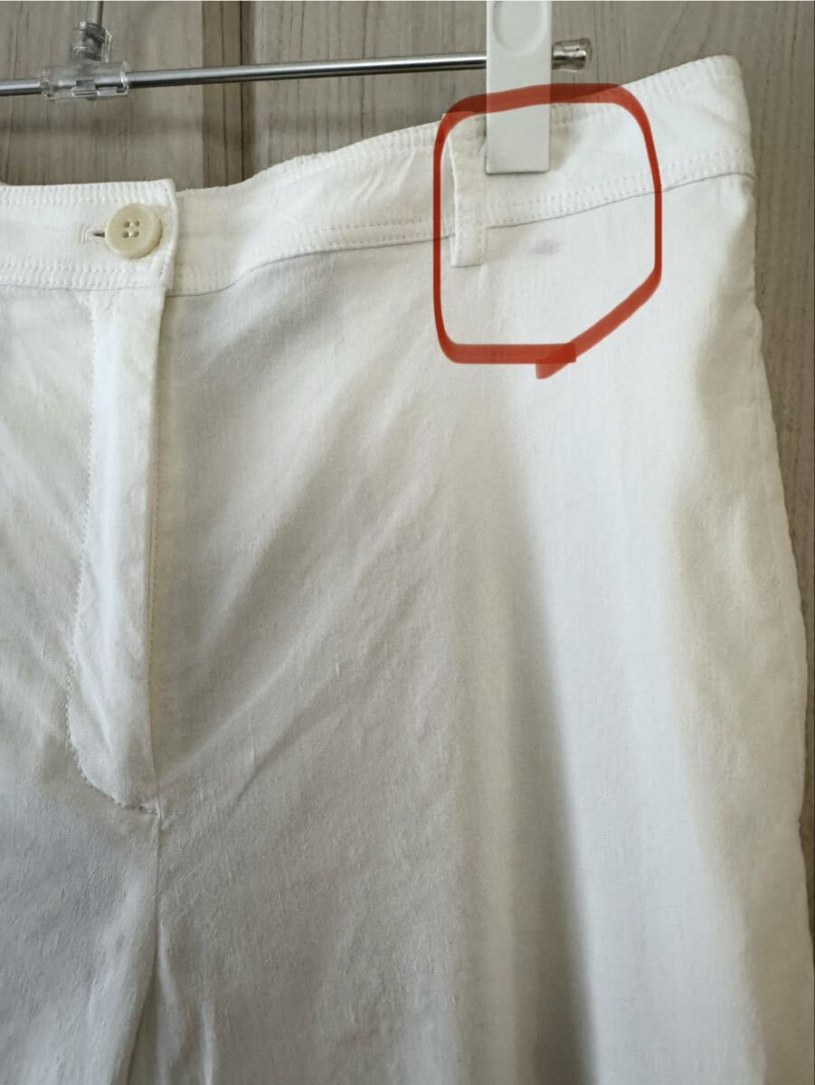 前見頃左上部分に小さい薄いシミあります。後ろ左ポケット糸ホツレあり。ご了承下さい。写真を参考にお願いいたします。