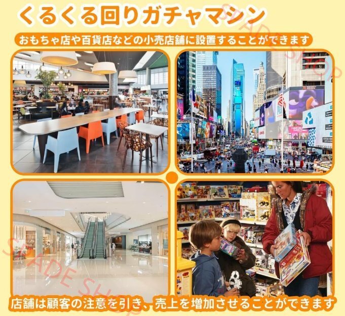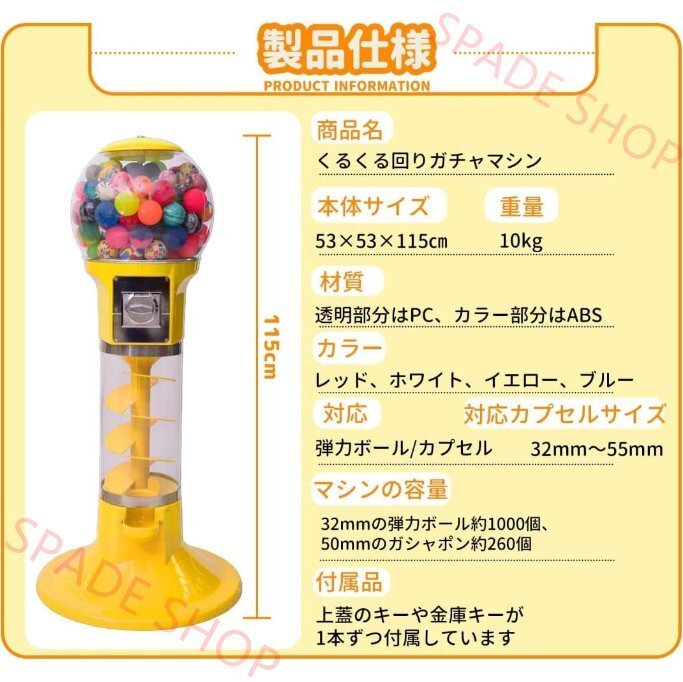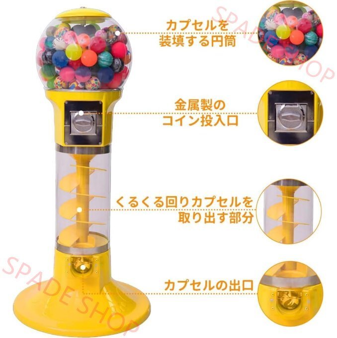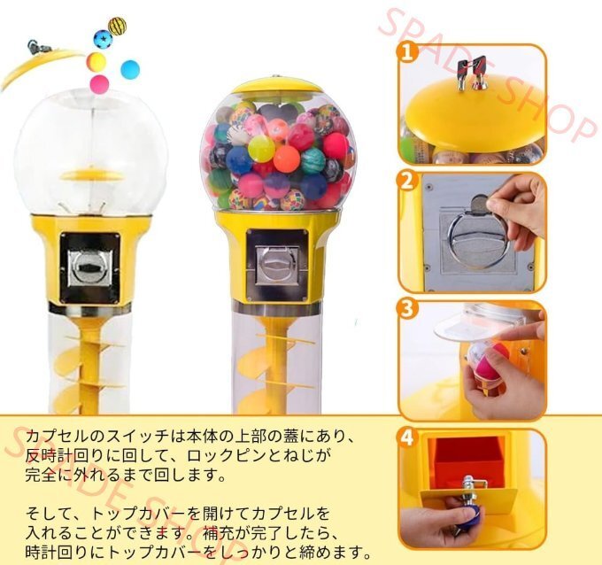 商品仕様商品特徴驚きと楽しさ満載の「くるくる回りガチャマシン」ドーム内でカプセルがくるくると軌道を描きながら回転し、落下するユニークな構造。毎回新しい驚きと楽しさを提供します。 高品質な素材で安心安全本体は耐久性耐熱性耐衝撃性に優れた高品質PC(ポリカーボネート)とABS素材を採用。長く安心してお使いいただけます。 操作簡単電源不要100円硬貨を投入し、ハンドルを一回転させるだけでカプセルが出てきます。電源は不要、誰でもすぐに楽しめるシンプル設計です。 各部のこだわり使用シーン例 |