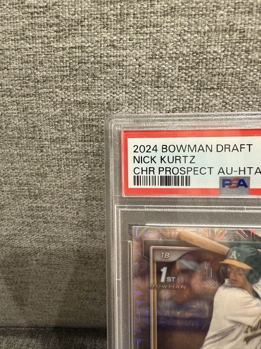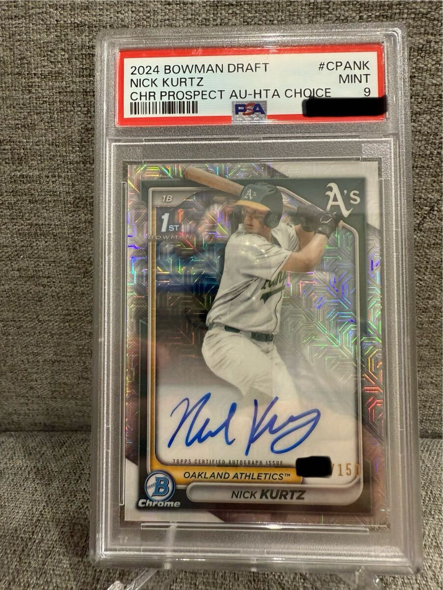 1試合に4HRを放つなどの活躍が目立ちア・リーグ新人王候補筆頭のニック・カーツ NICK KURTZ選手の初めてのオートグラフのカードとなったPSA鑑定も済んでいる1st BOWMANの貴重なHTA柄150シリです。