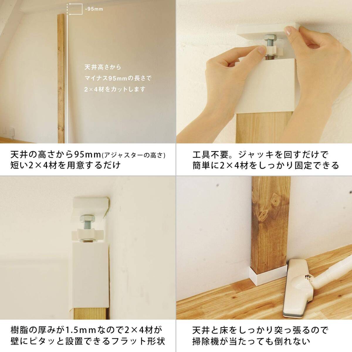 【対応木材】2×4 木材 【取付寸法】(天井の高さ)2750mmまで【木材カットの目安】取付場所の高さより95mm短い木材をご用意ください。