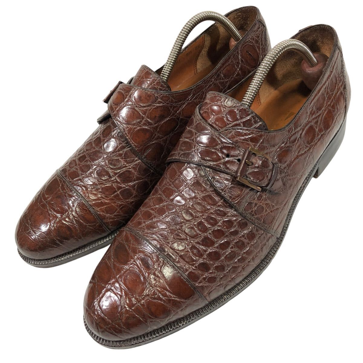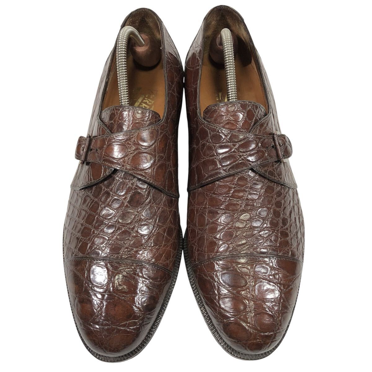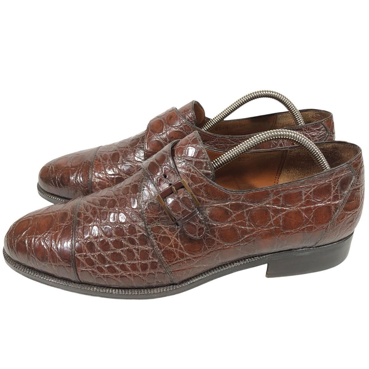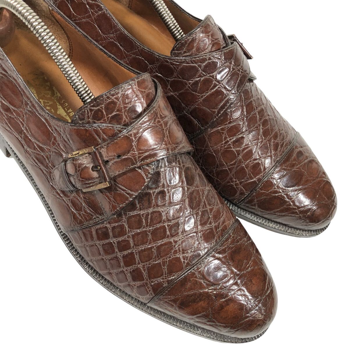 【フェラガモ】本物 Ferragamo 靴 26.5cm 総クロコダイル モンクストラップ ビジネスシューズ ワニ革 男性用 メンズ 伊製 8 1/2 EE