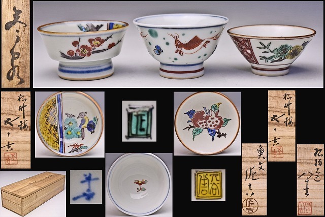 徳田八十吉 初代 / 松本佐吉 / 浅蔵五十吉 ★ 九谷焼作家 3種 ぐい呑 ★ 共箱 ★ 九谷を代表する名工の夢のセット ★ 酒器 盃 杯 ★