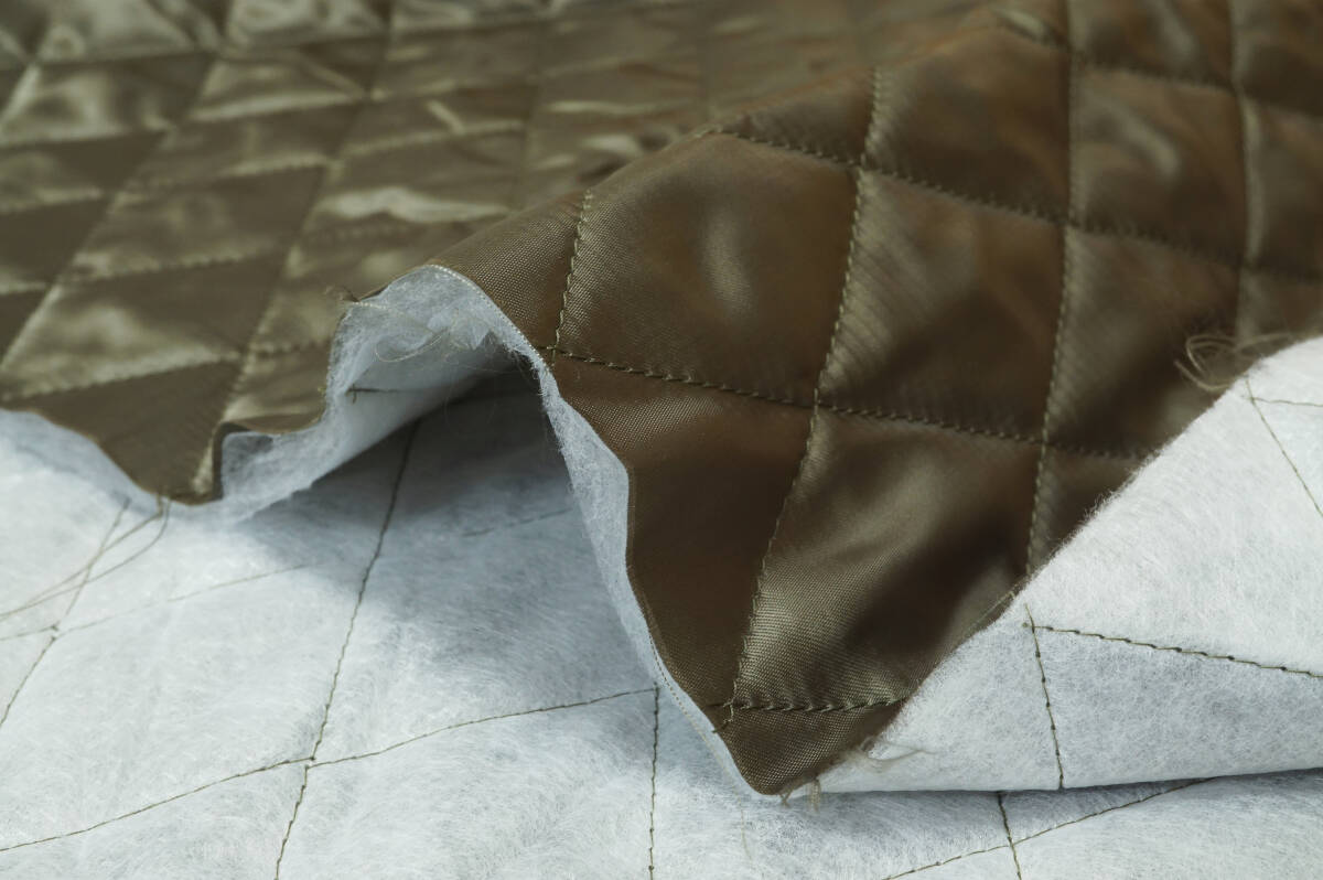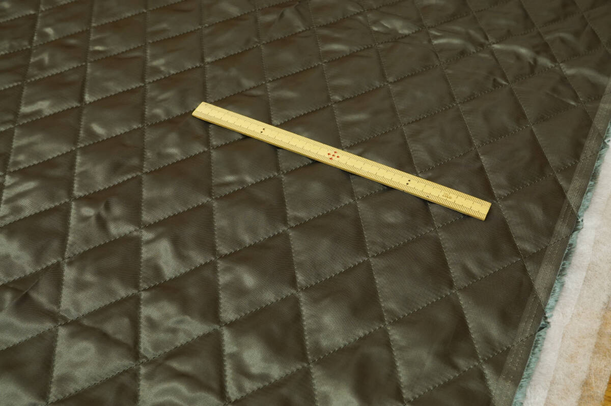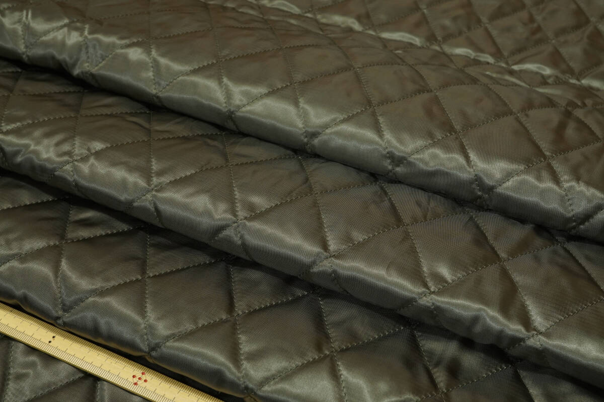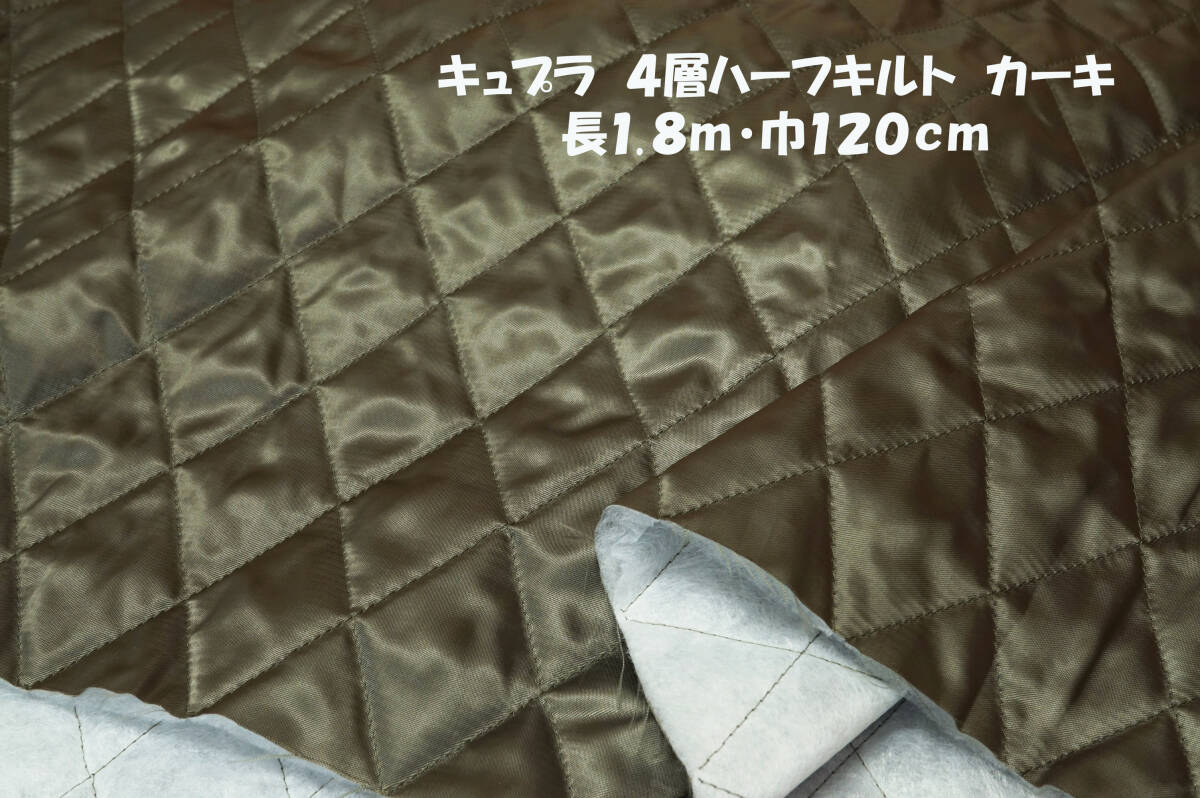 キュプラ100%、キュプラ・不織布・中わた・不織布の4層構造、キルトの中では微薄タイプ、しなやかなソフト系、微光沢、色調:カーキでございます。