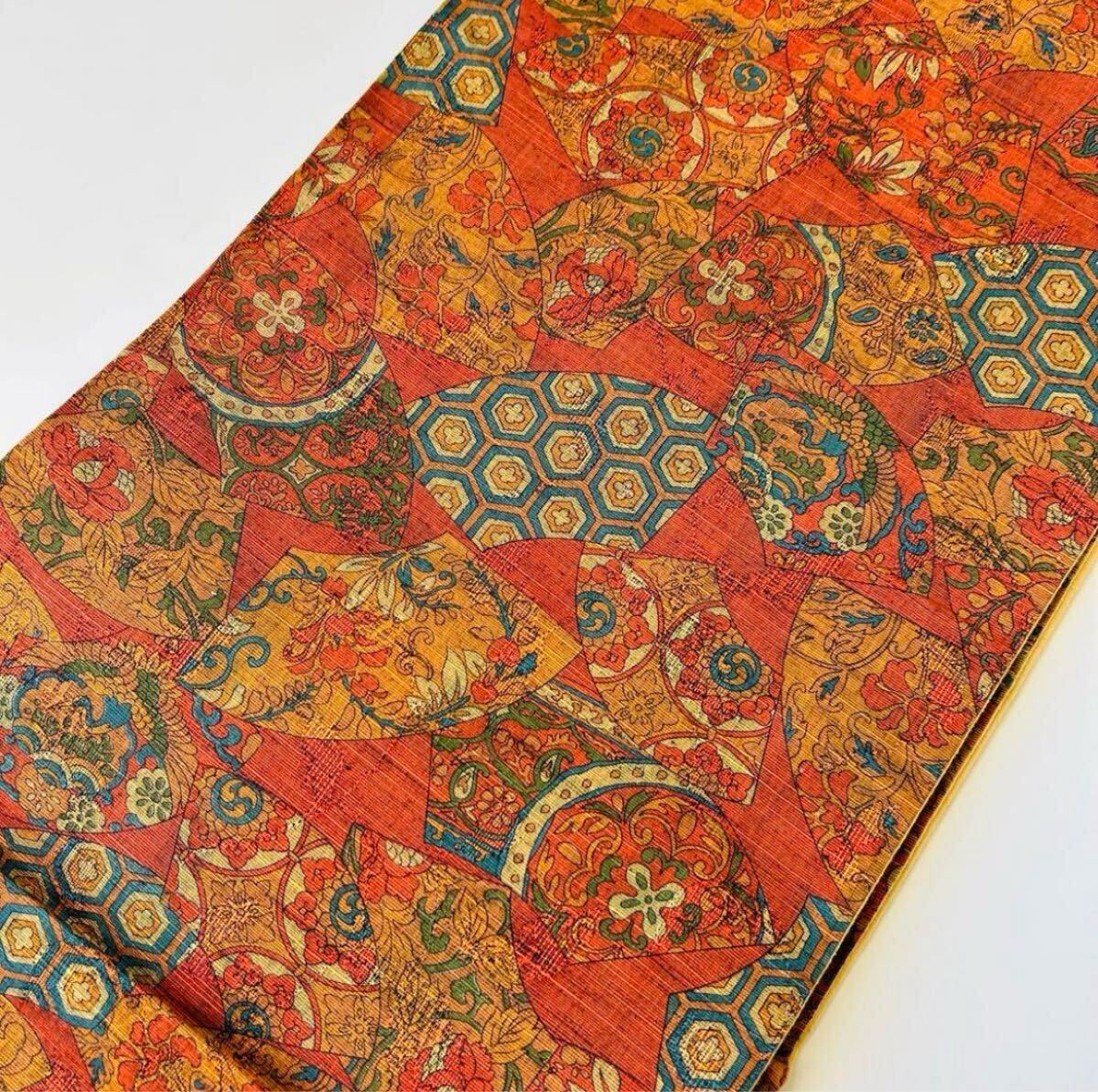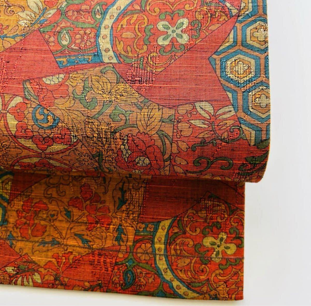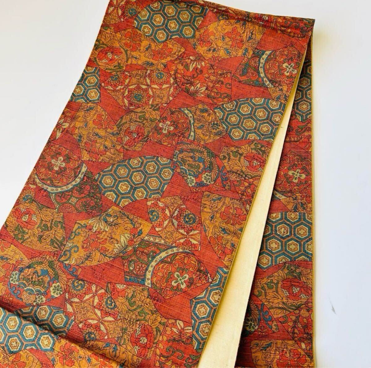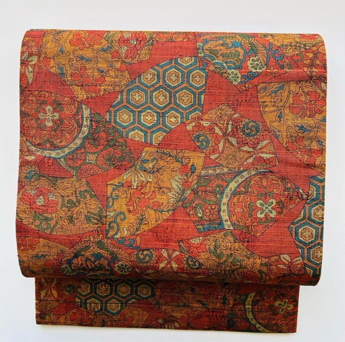 【楓】洒落袋帯 正絹 扇に亀甲やお華 唐草 総柄 KU-3663
