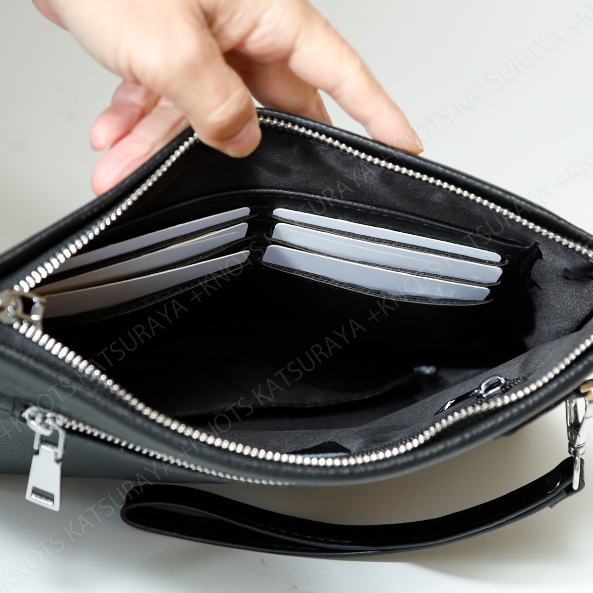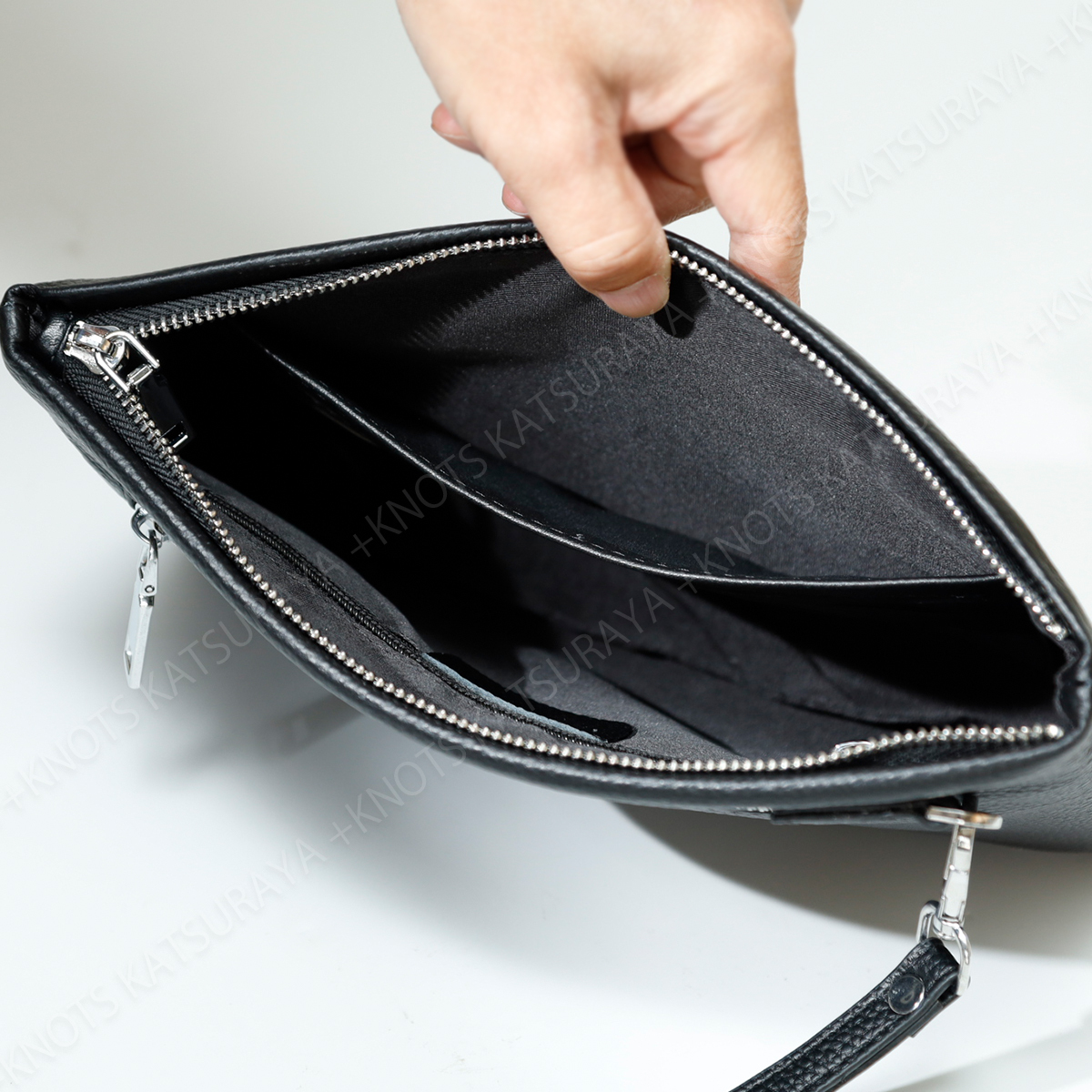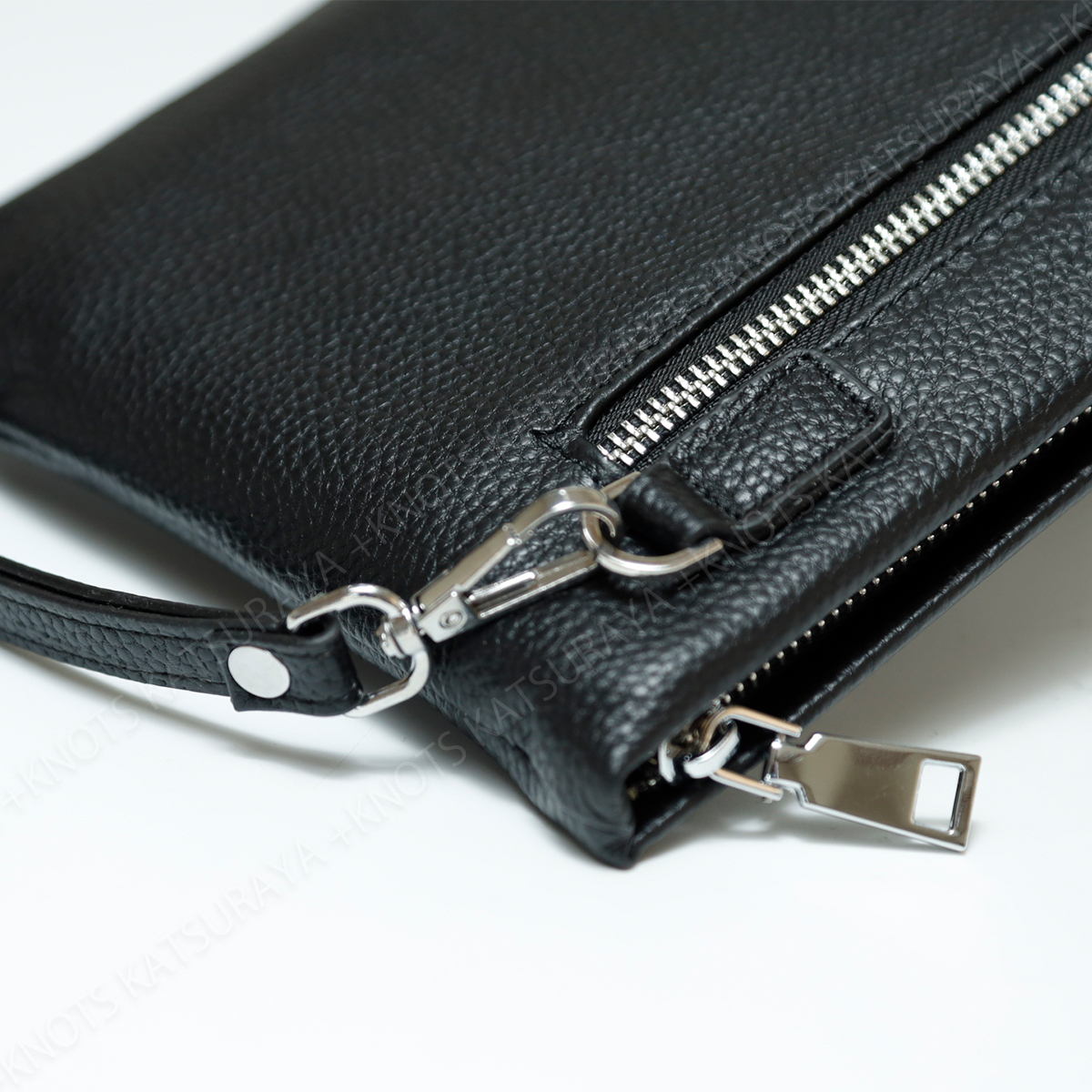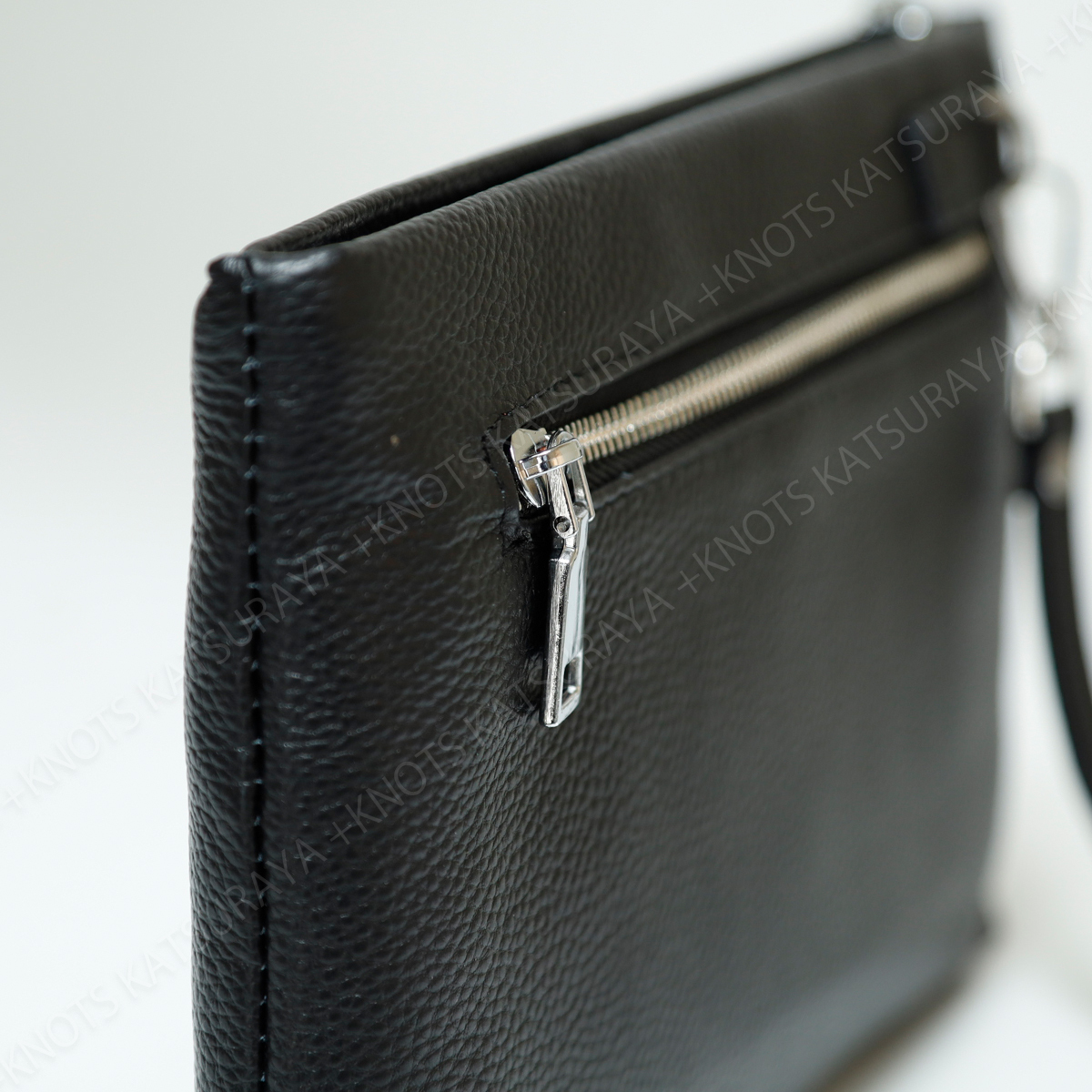 主張しすぎない、無地のシンプルなクラッチバッグです。内部には大き目のオープンポケット、カード入れ6か所、ワイドなファスナーポケットを装備。素材はキズや汚れが目立ちにくいシボのある本革を採用しました。クラッチバッグとして基本的な機能性を重視されている方におすすめです。